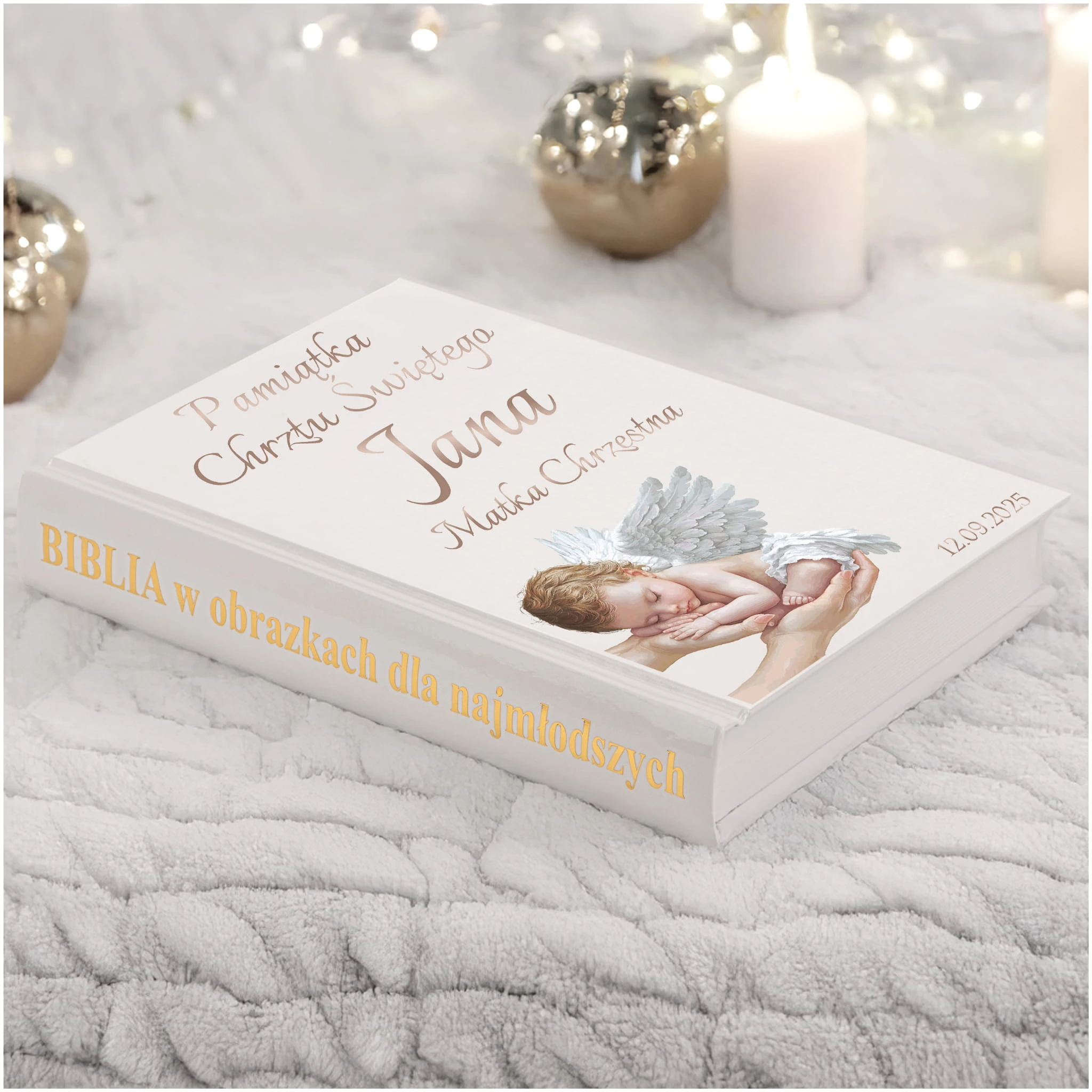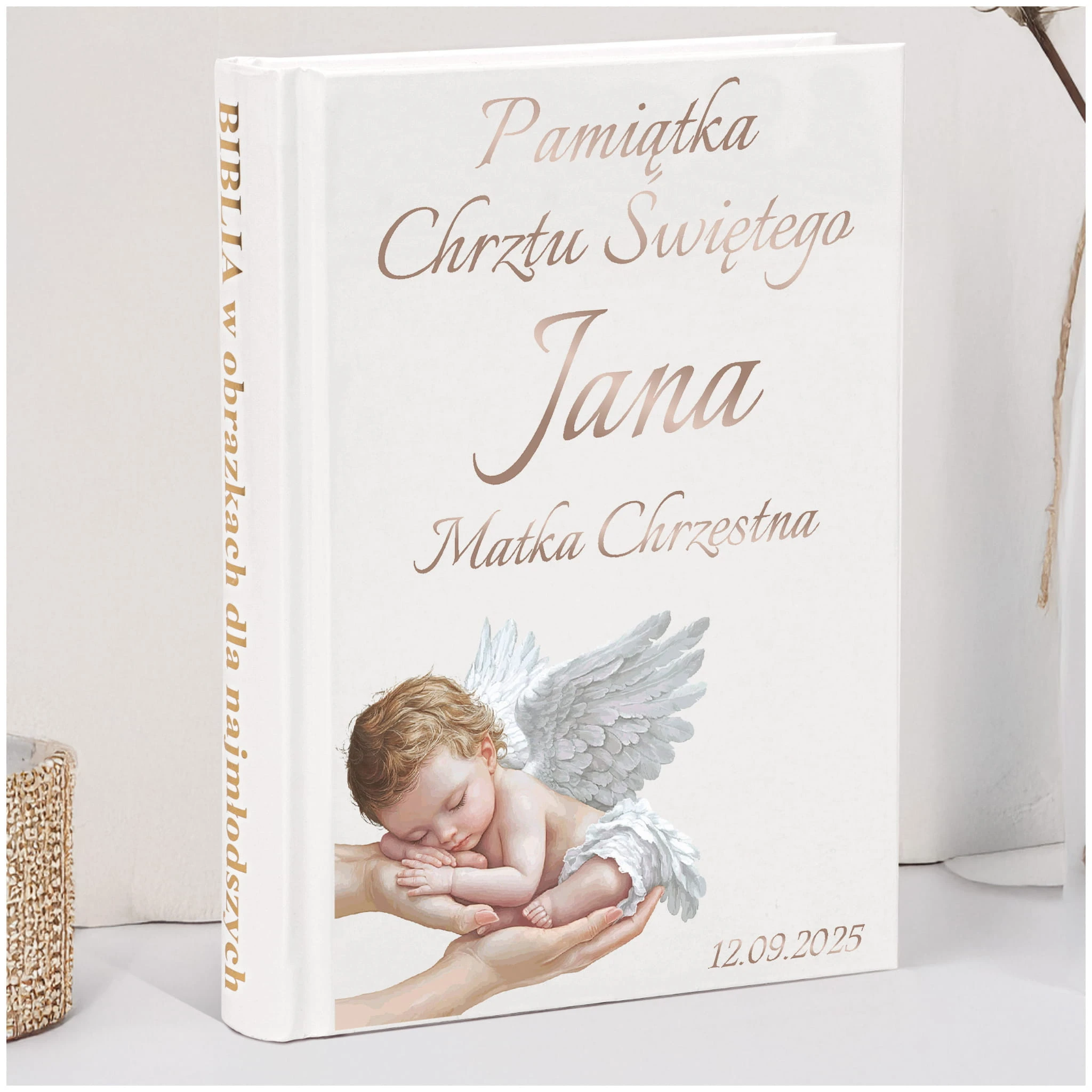 ✅ Druk na zewnątrz w cenie biblii: Imię dziecka + data chrztu + dedykacja.