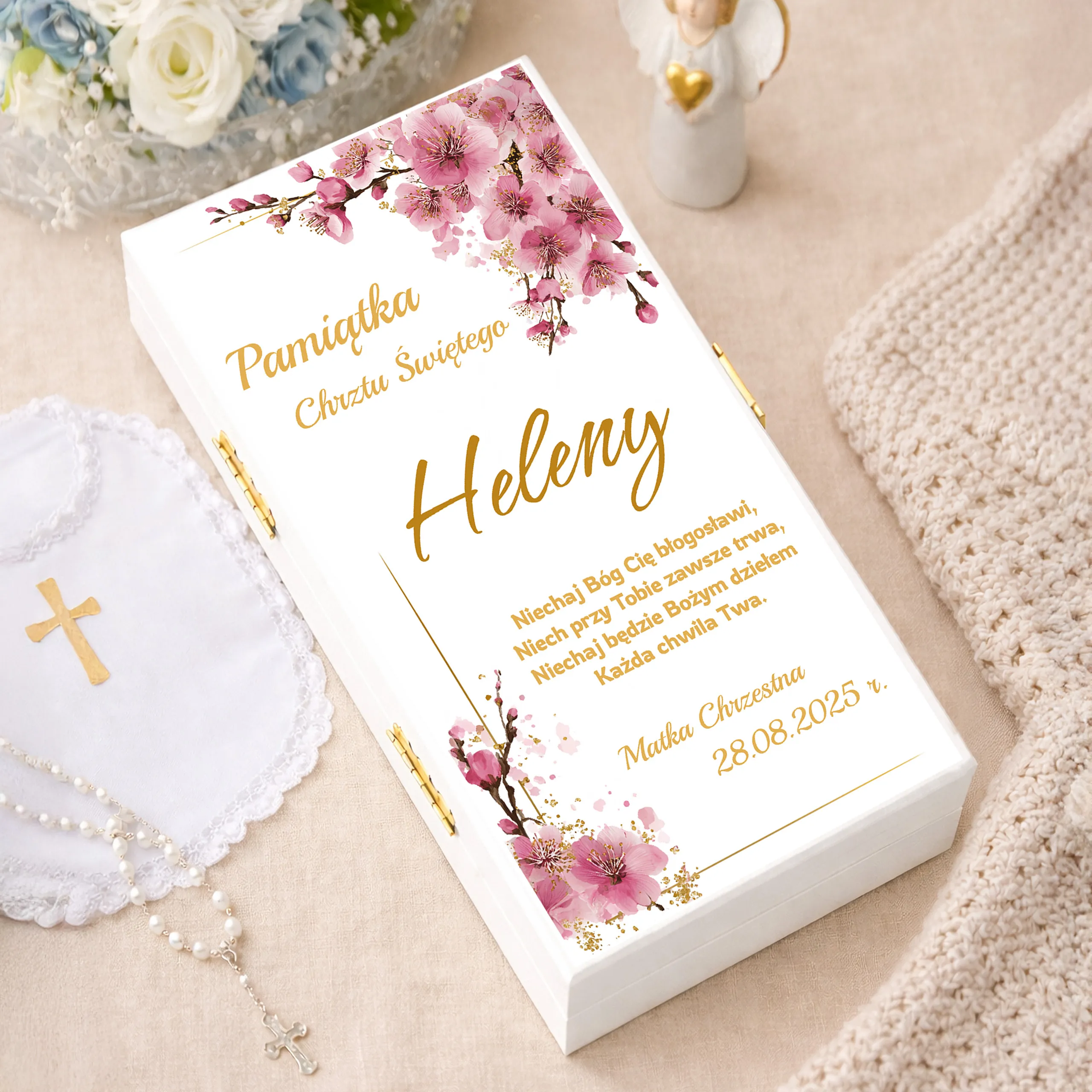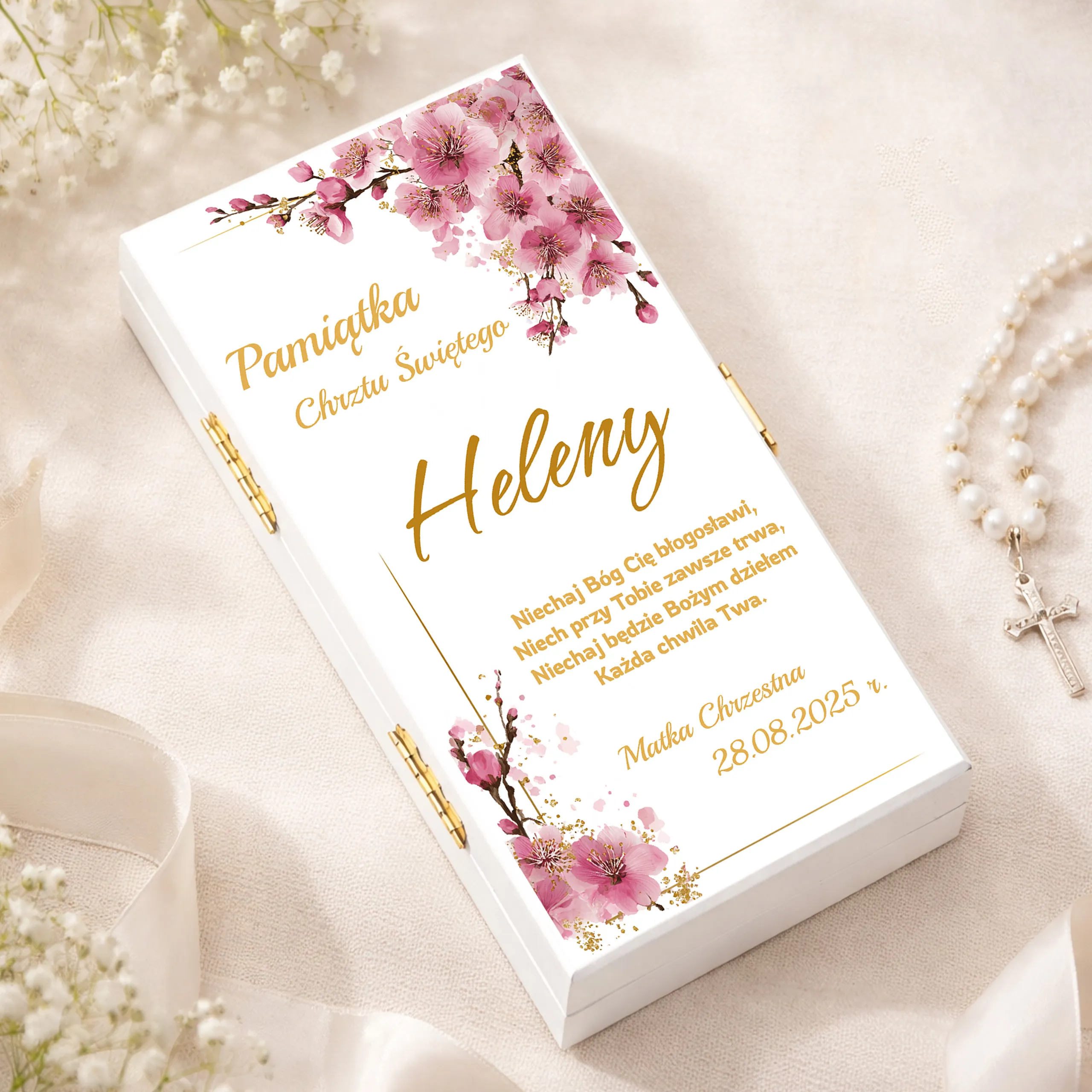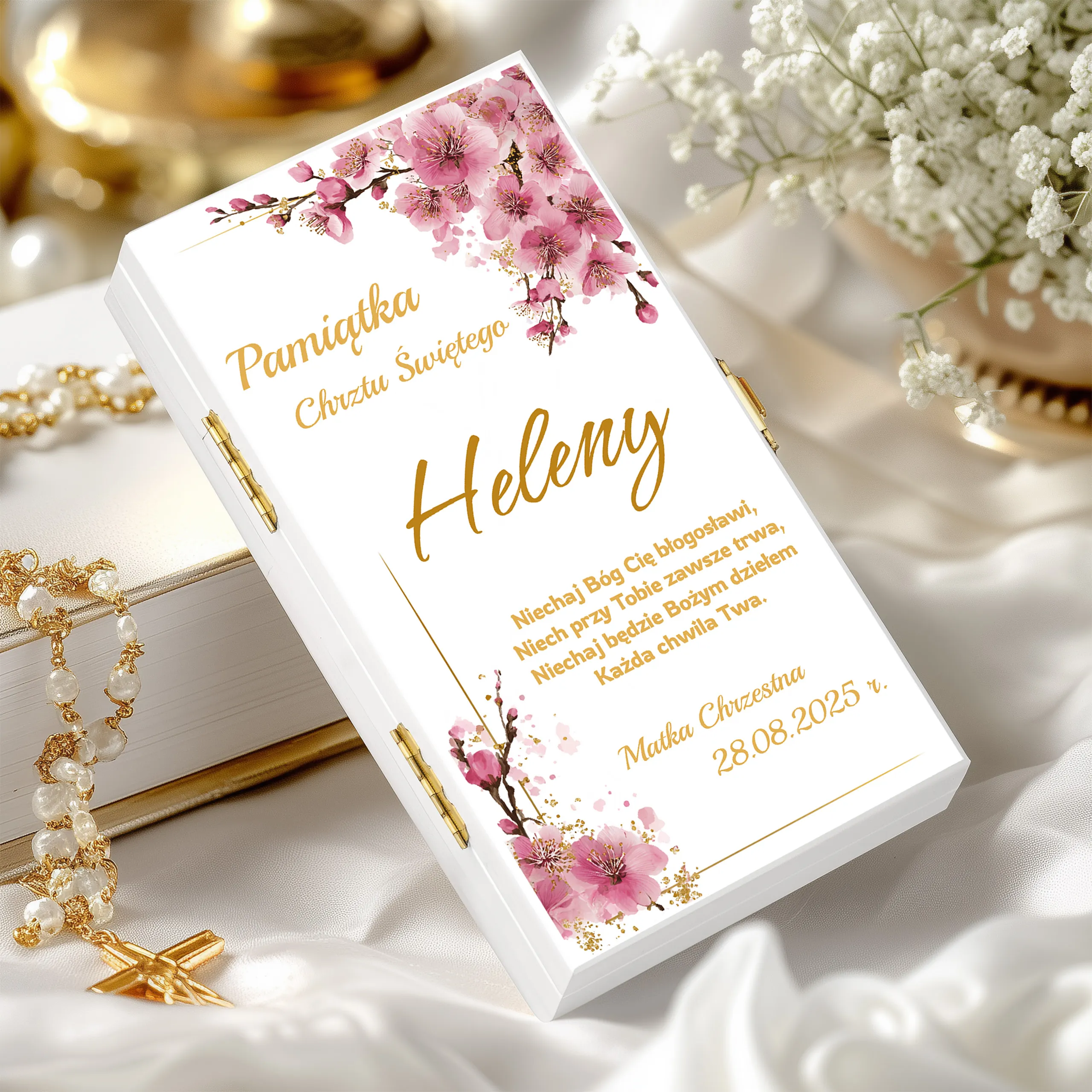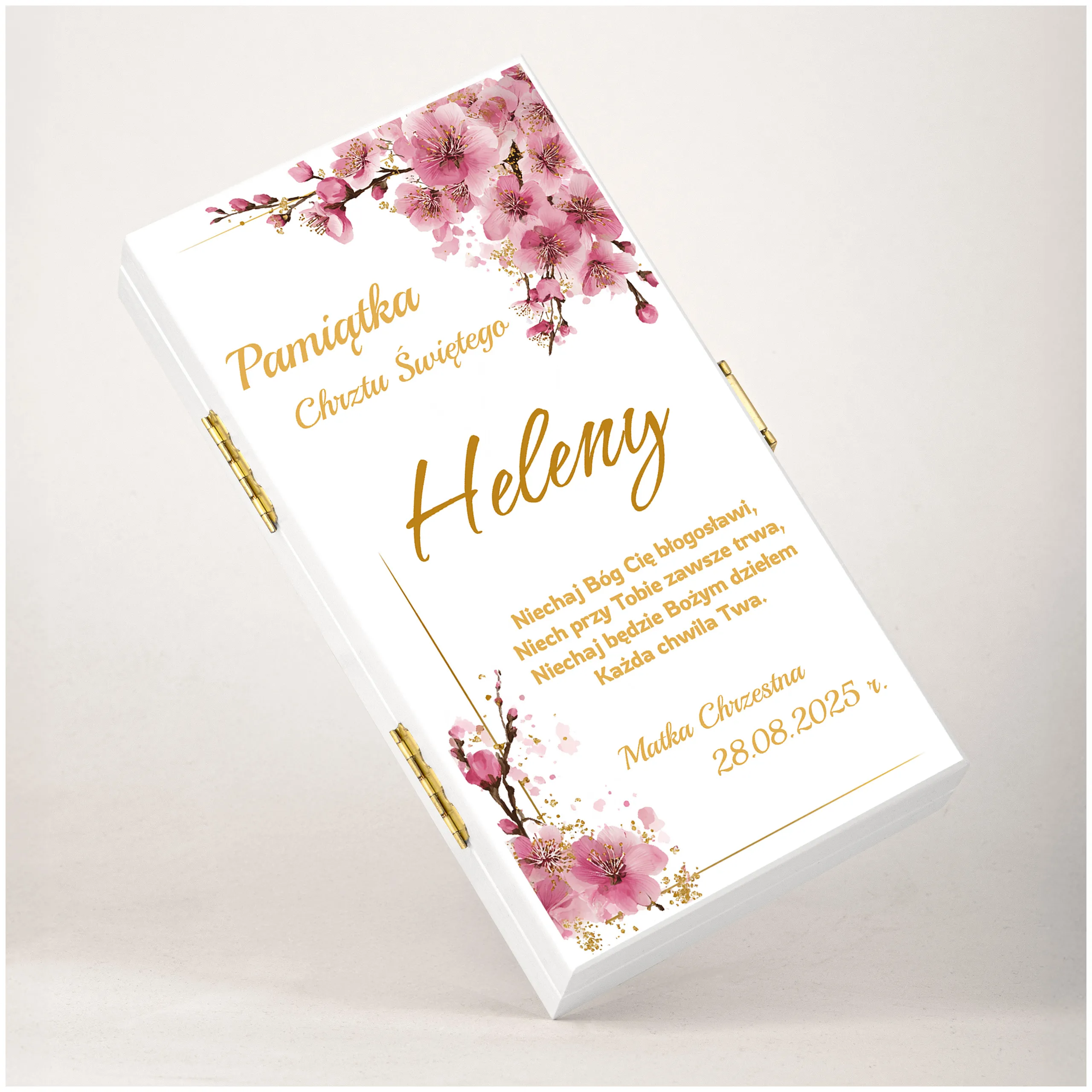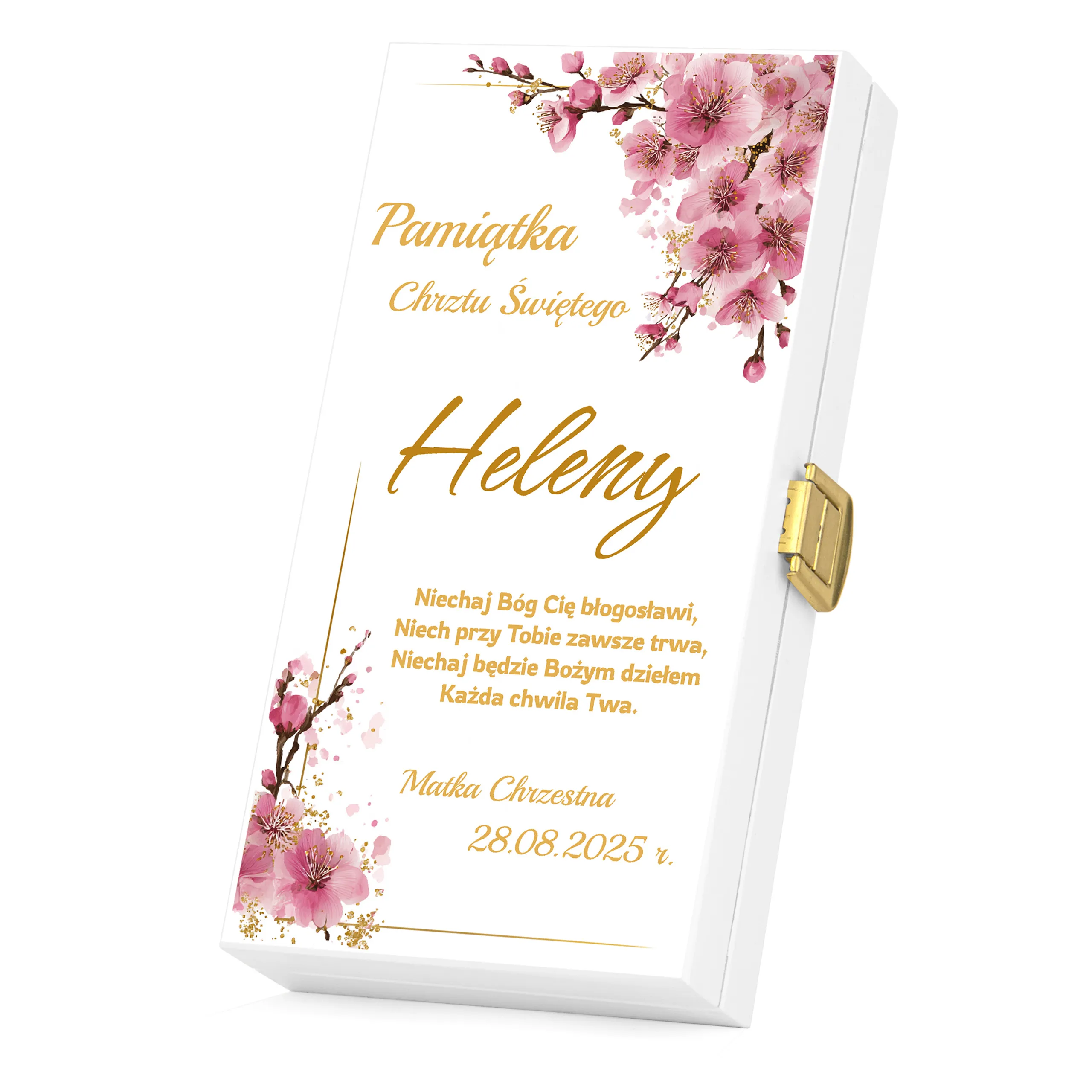 To personalizowane pudełko to wyjątkowa pamiątka, która pozostanie z dzieckiem na lata. Subtelny wzór w złotej tonacji oraz możliwość dodania imienia, daty i podpisu (np. Matka Chrzestna, Dziadkowie, Rodzice Chrzestni) sprawiają, że prezent nabiera osobistego charakteru.
