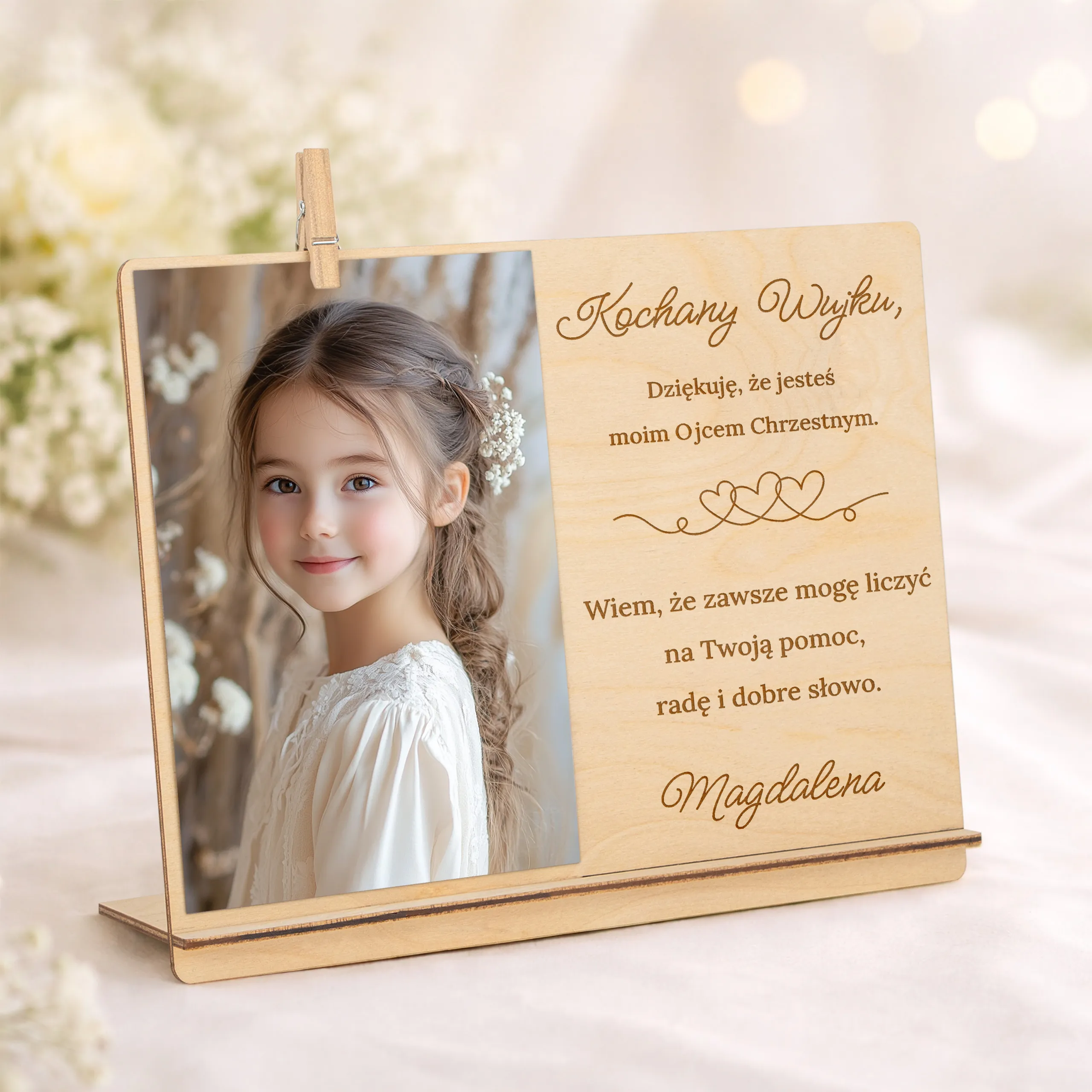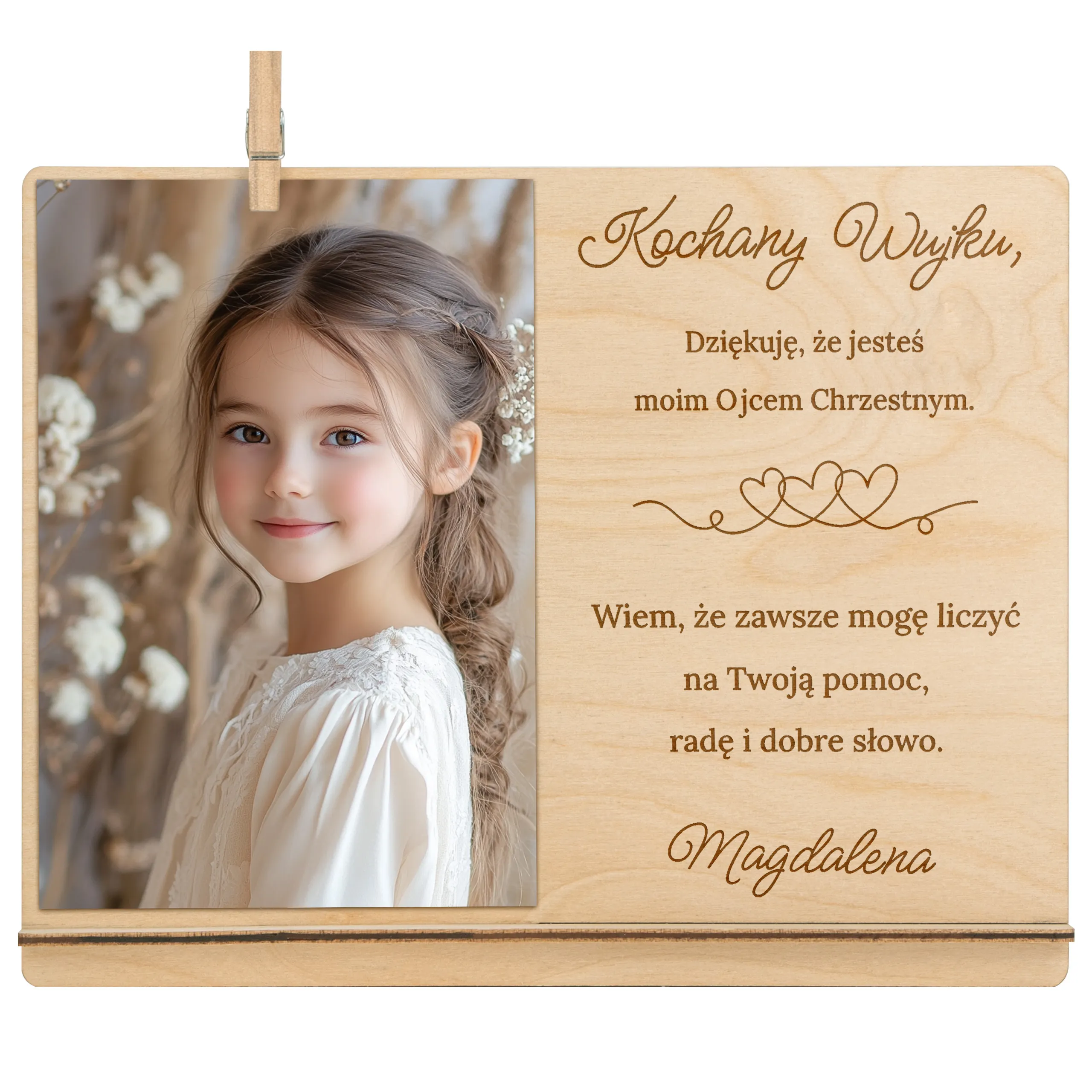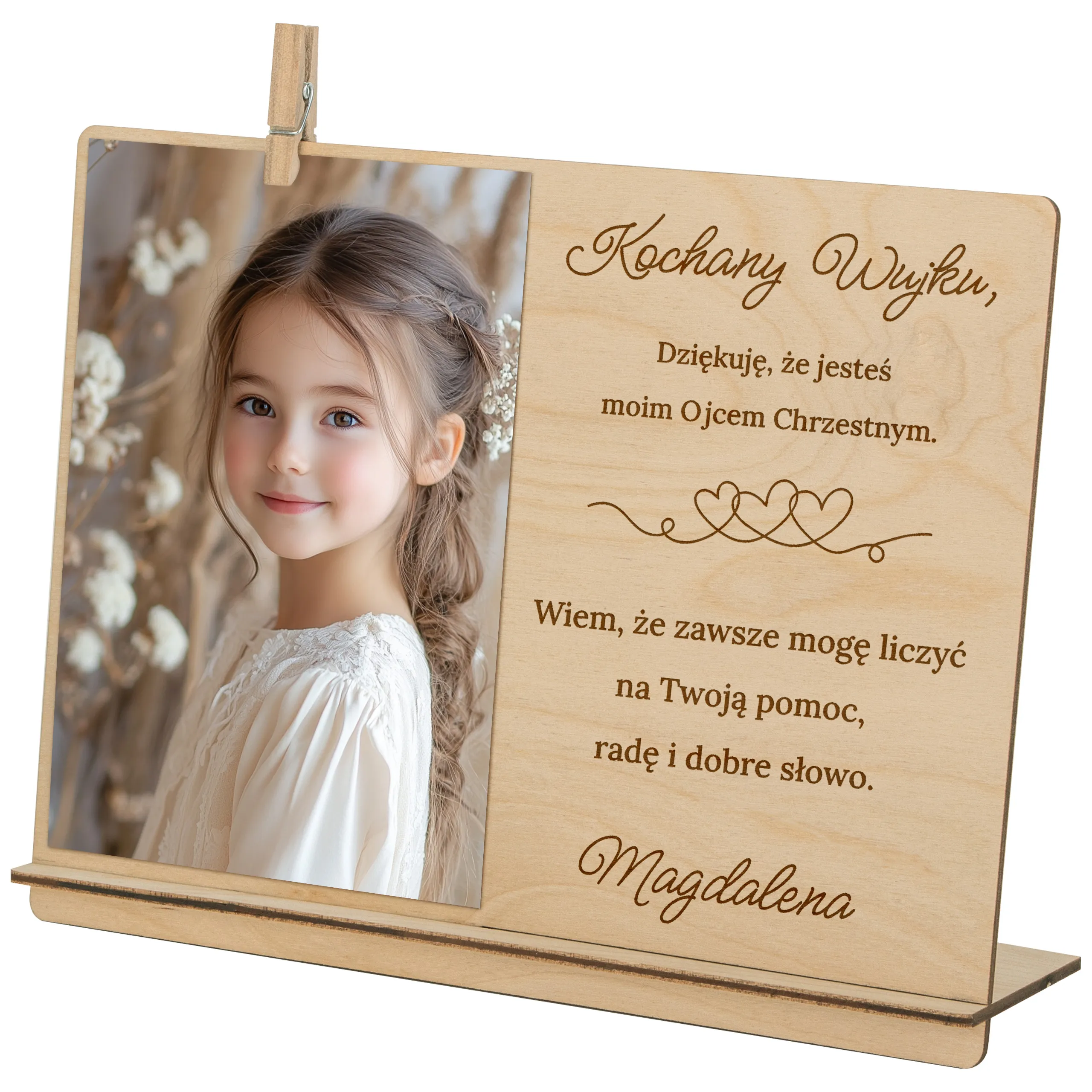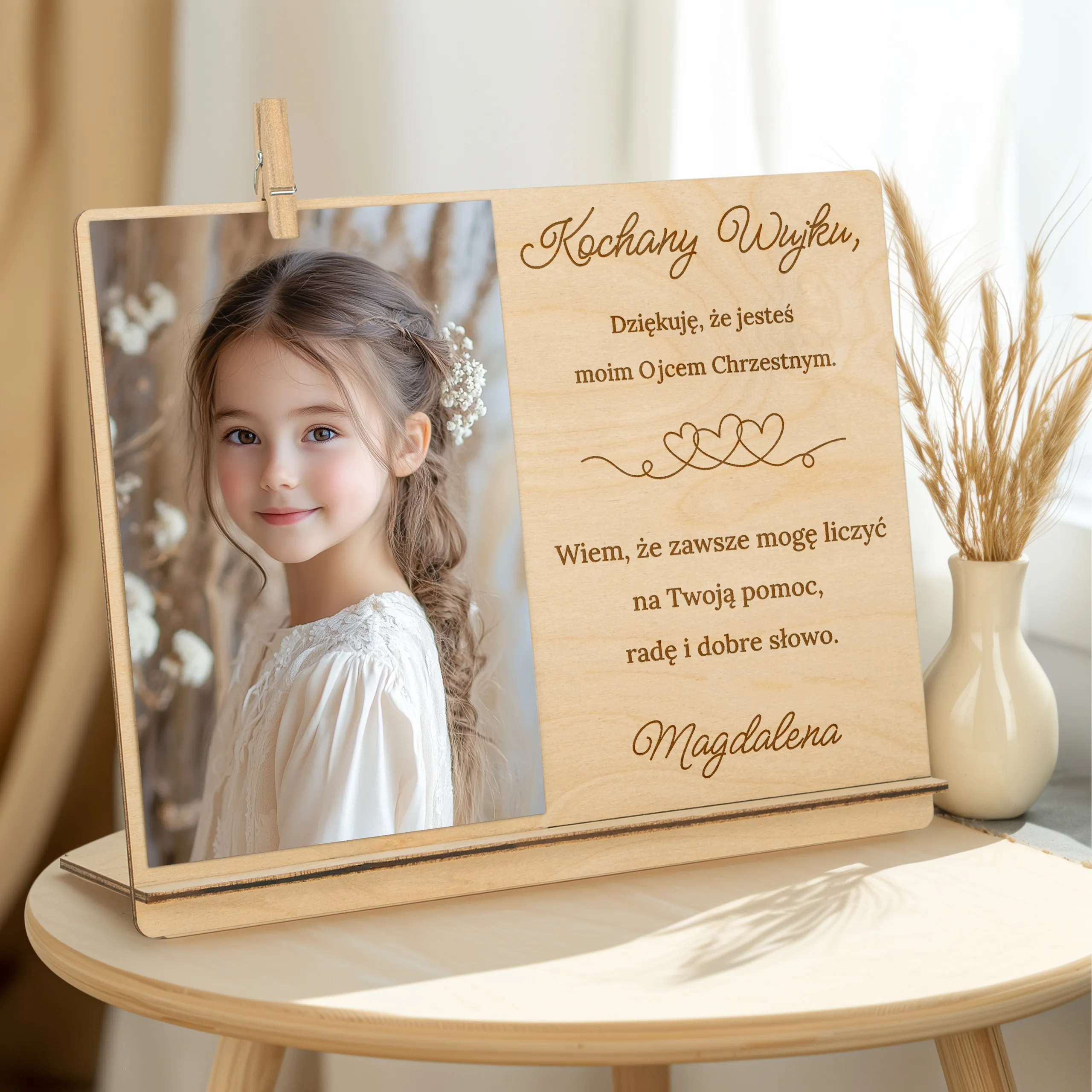 Ta elegancka, drewniana ramka z grawerowanym podziękowaniem to piękna i trwała pamiątka, która wzruszy i pozostanie na lata. Idealna jako prezent od dziecka w tym wyjątkowym dniu!