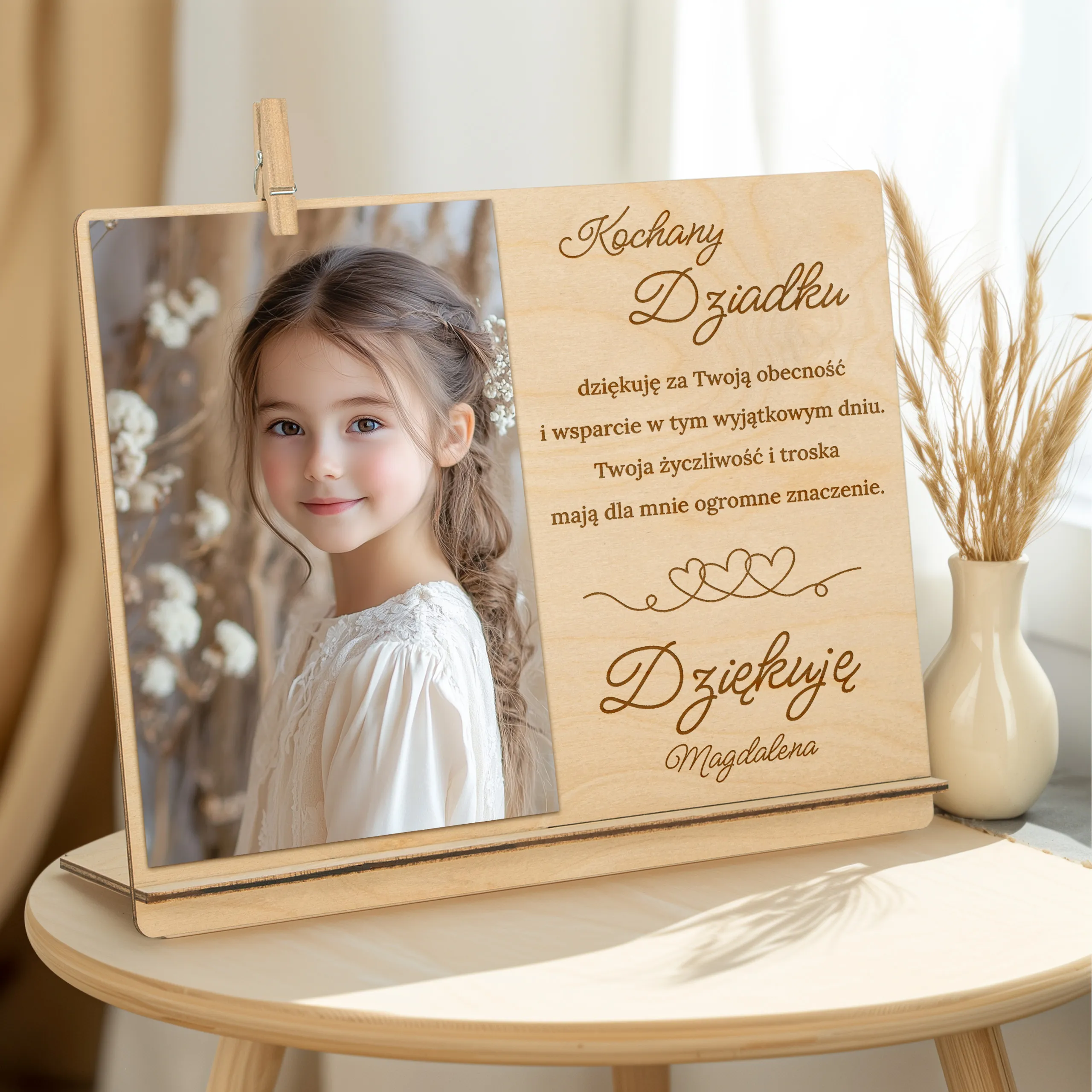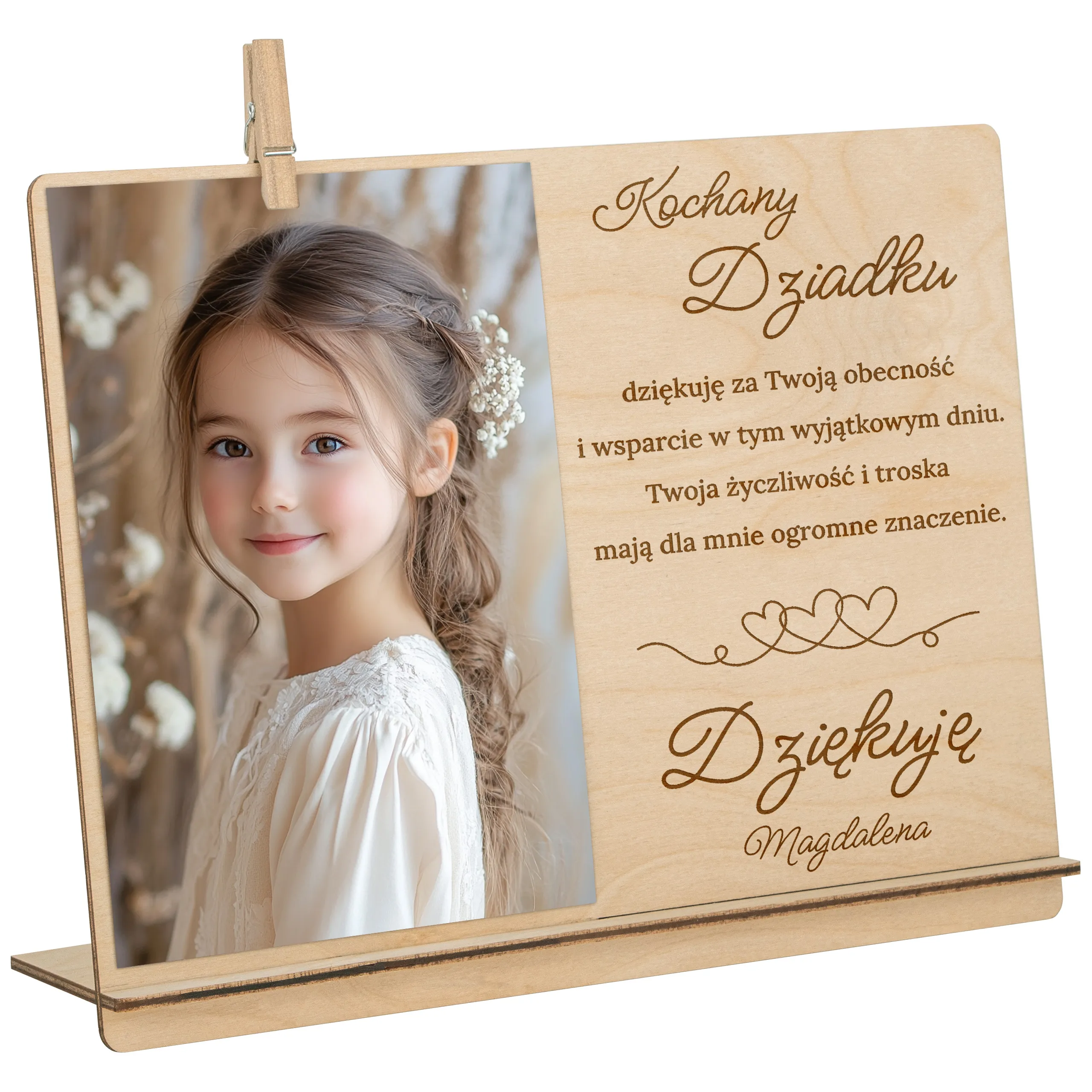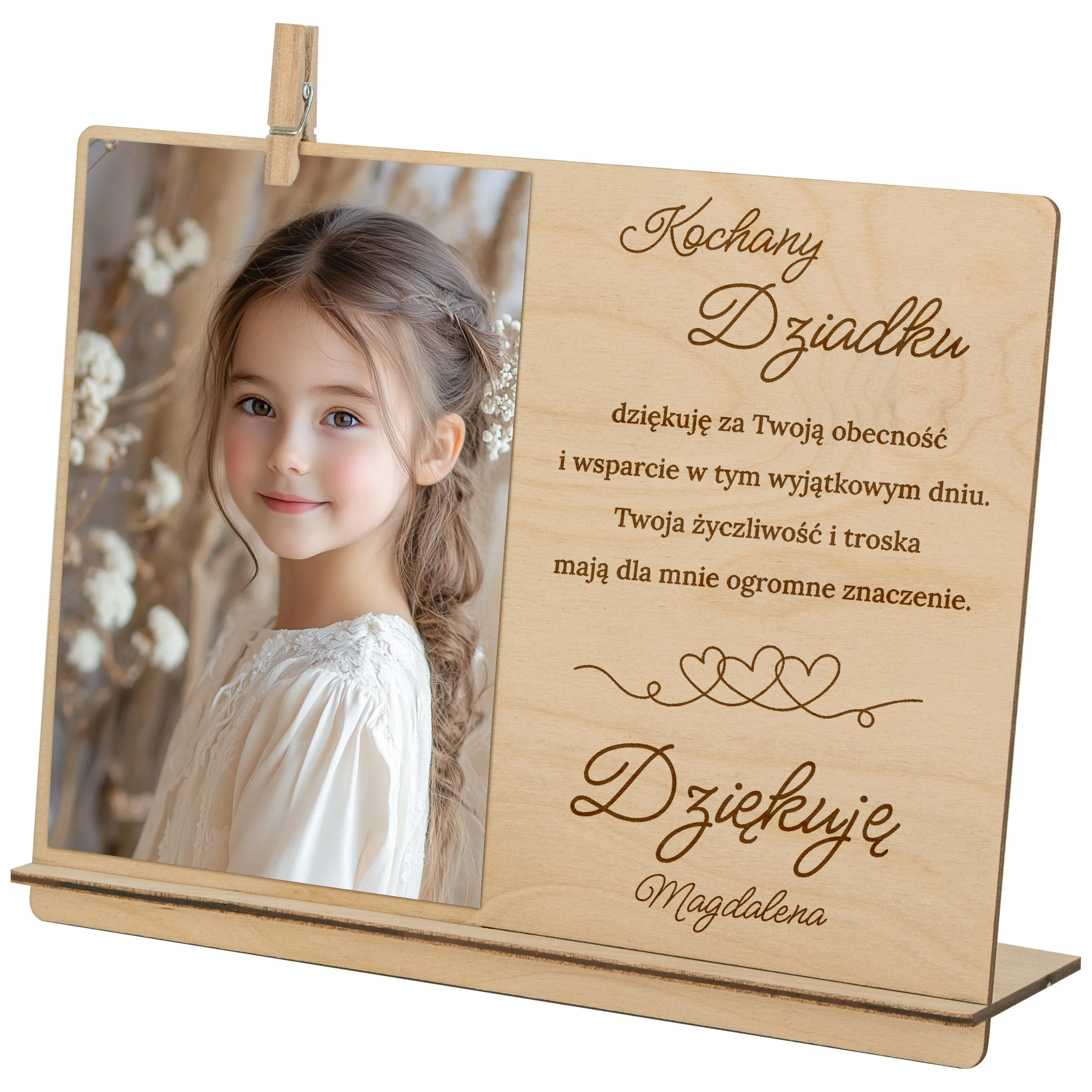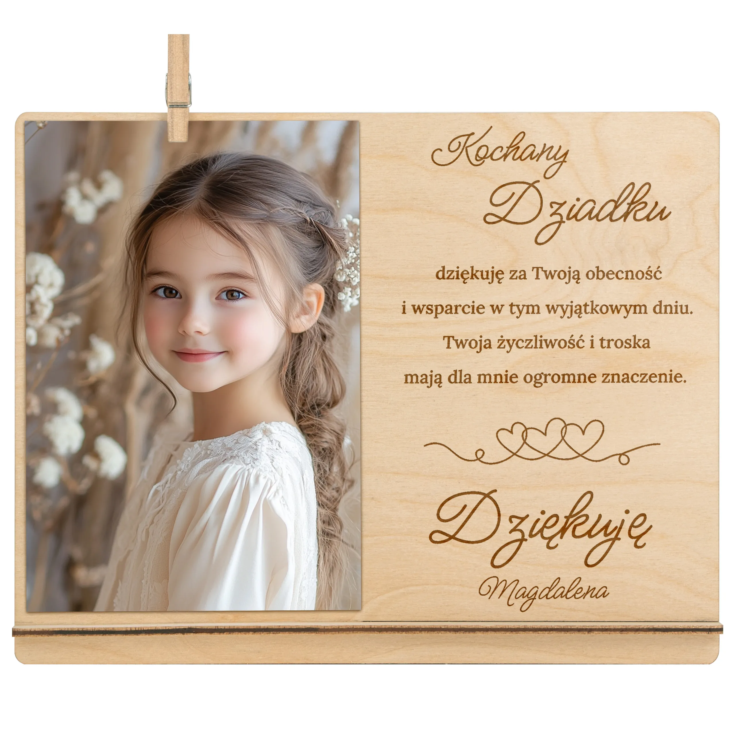 Ta elegancka, drewniana ramka z grawerowanym podziękowaniem to piękna i trwała pamiątka, która wzruszy i pozostanie na lata. Idealna jako prezent od dziecka w tym wyjątkowym dniu!