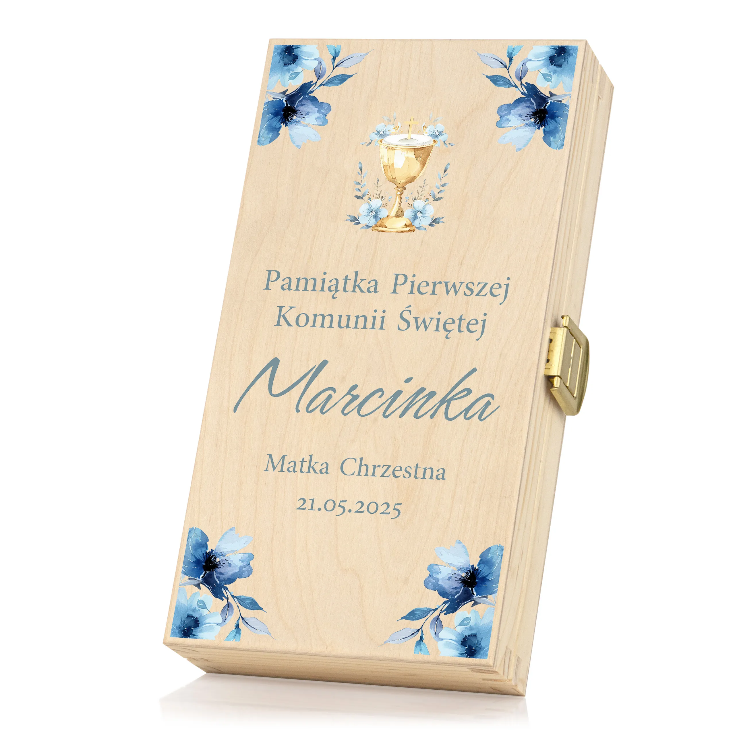 To personalizowane pudełko to wyjątkowa pamiątka, która pozostanie z dzieckiem na lata. Subtelny wzór w złotej tonacji oraz możliwość dodania imienia, daty i podpisu (np. Matka Chrzestna, Dziadkowie, Rodzice Chrzestni) sprawiają, że prezent nabiera osobistego charakteru.