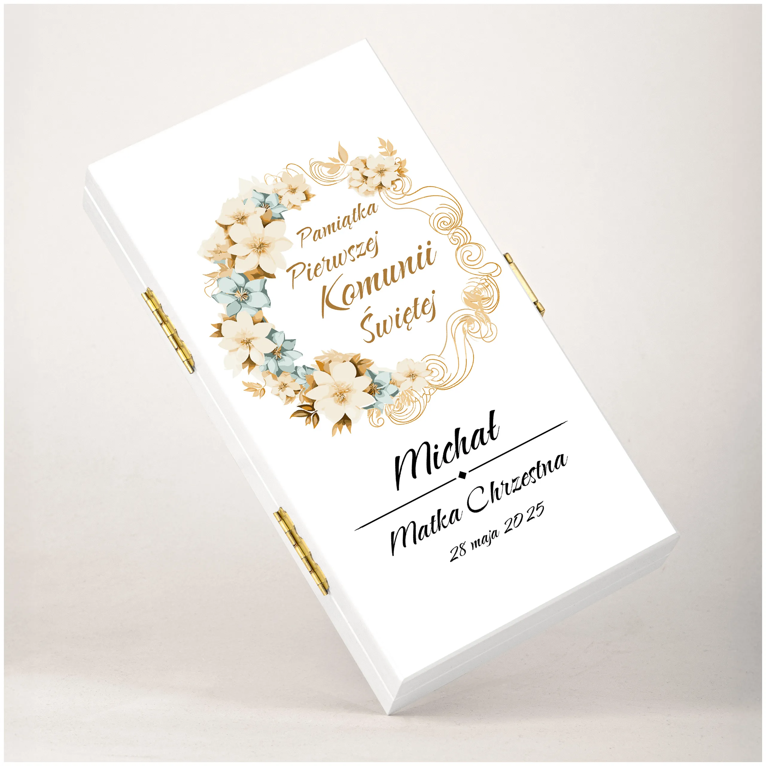 To personalizowane pudełko to wyjątkowa pamiątka, która pozostanie z dzieckiem na lata. Subtelny wzór w złotej tonacji oraz możliwość dodania imienia, daty i podpisu (np. Matka Chrzestna, Dziadkowie, Rodzice Chrzestni) sprawiają, że prezent nabiera osobistego charakteru.