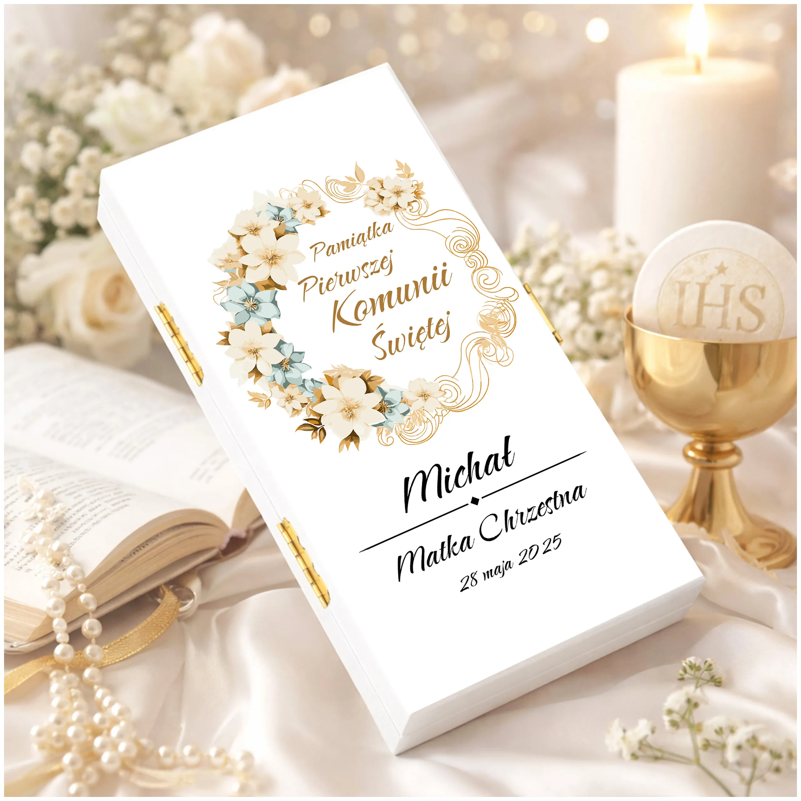 PAMIĄTKA PIERWSZEJ KOMUNII ŚWIĘTEJ - Pudełko na pieniądze na komunię, subtelna pamiątka na lata!