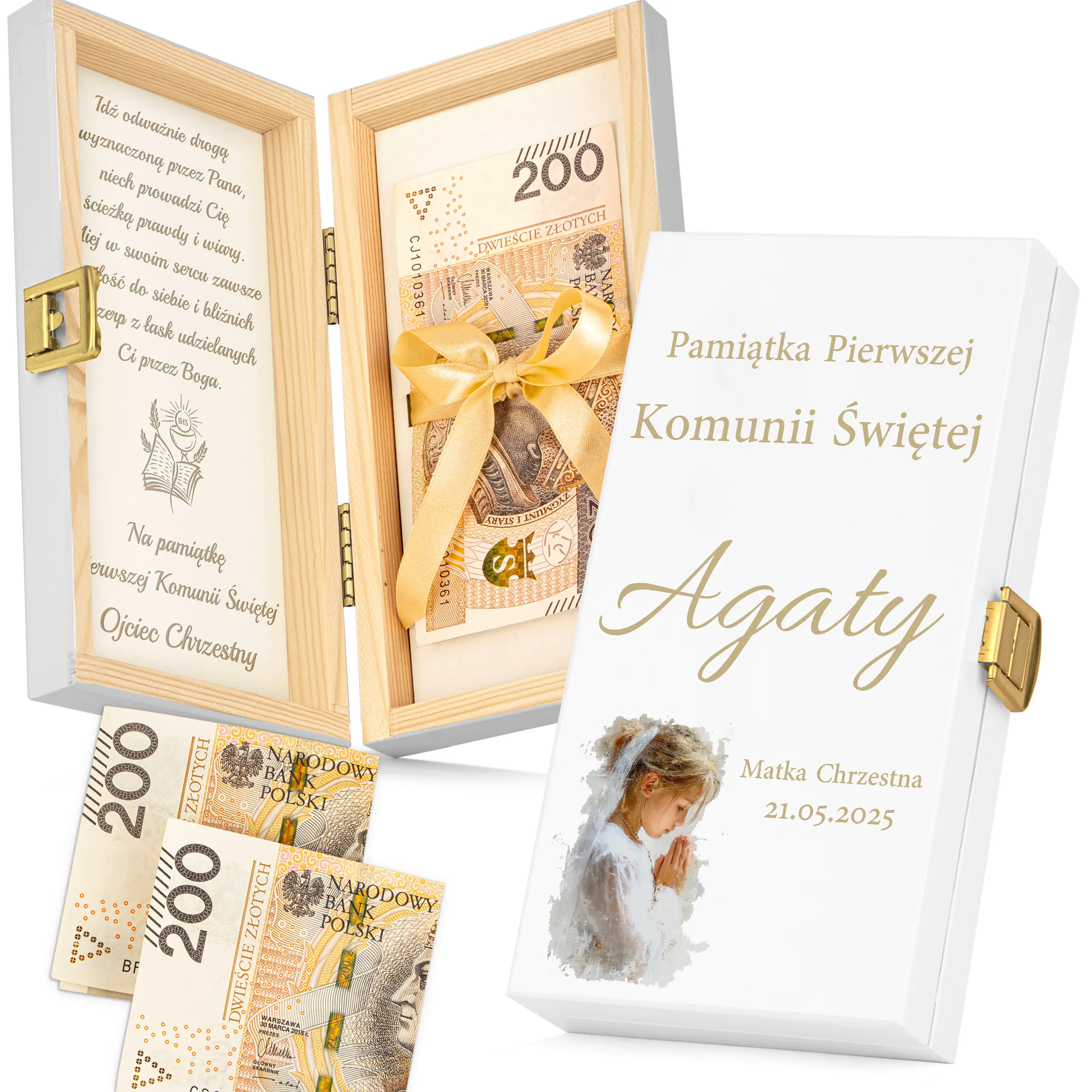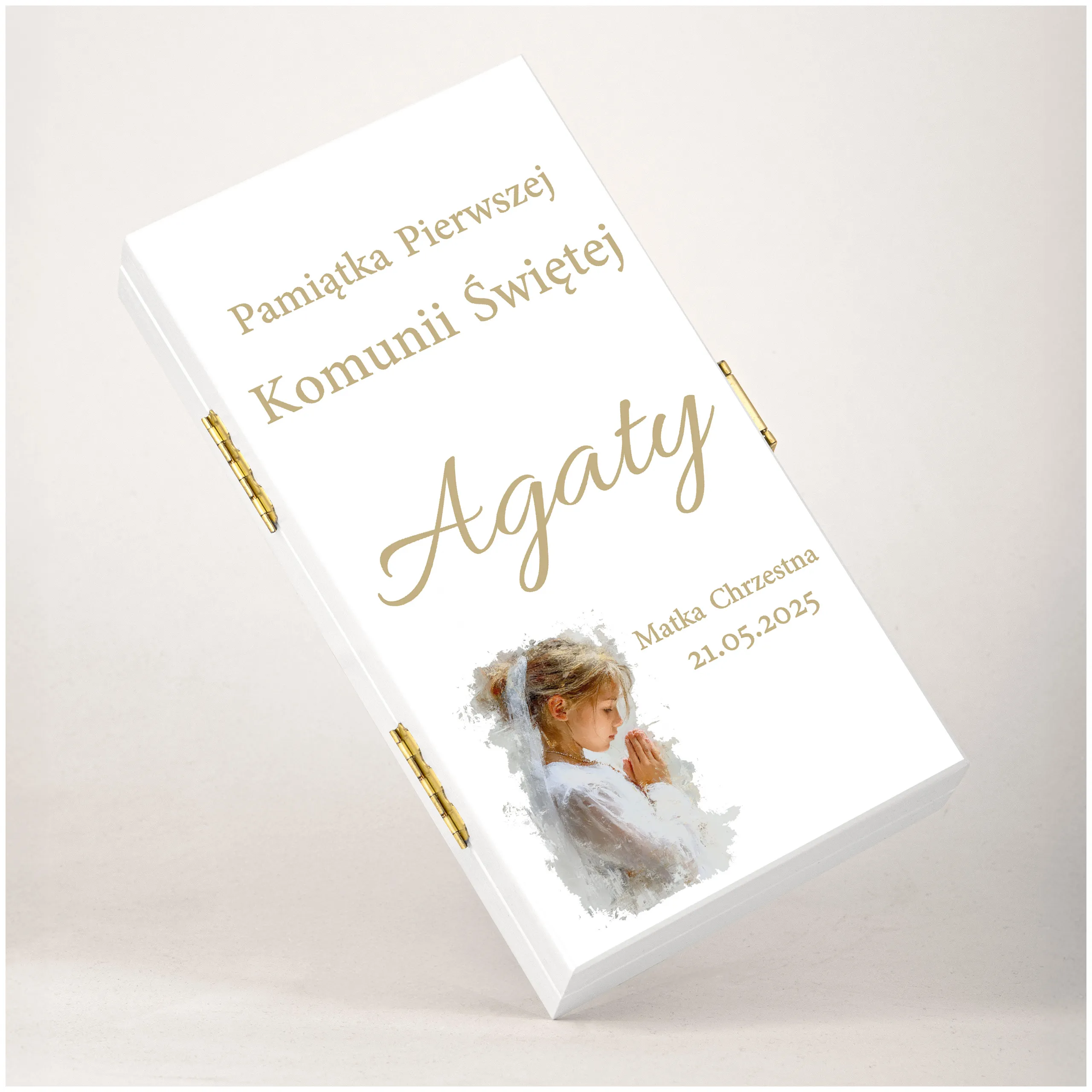 PAMIĄTKA PIERWSZEJ KOMUNII ŚWIĘTEJ - Pudełko na pieniądze na komunię, subtelna pamiątka na lata!