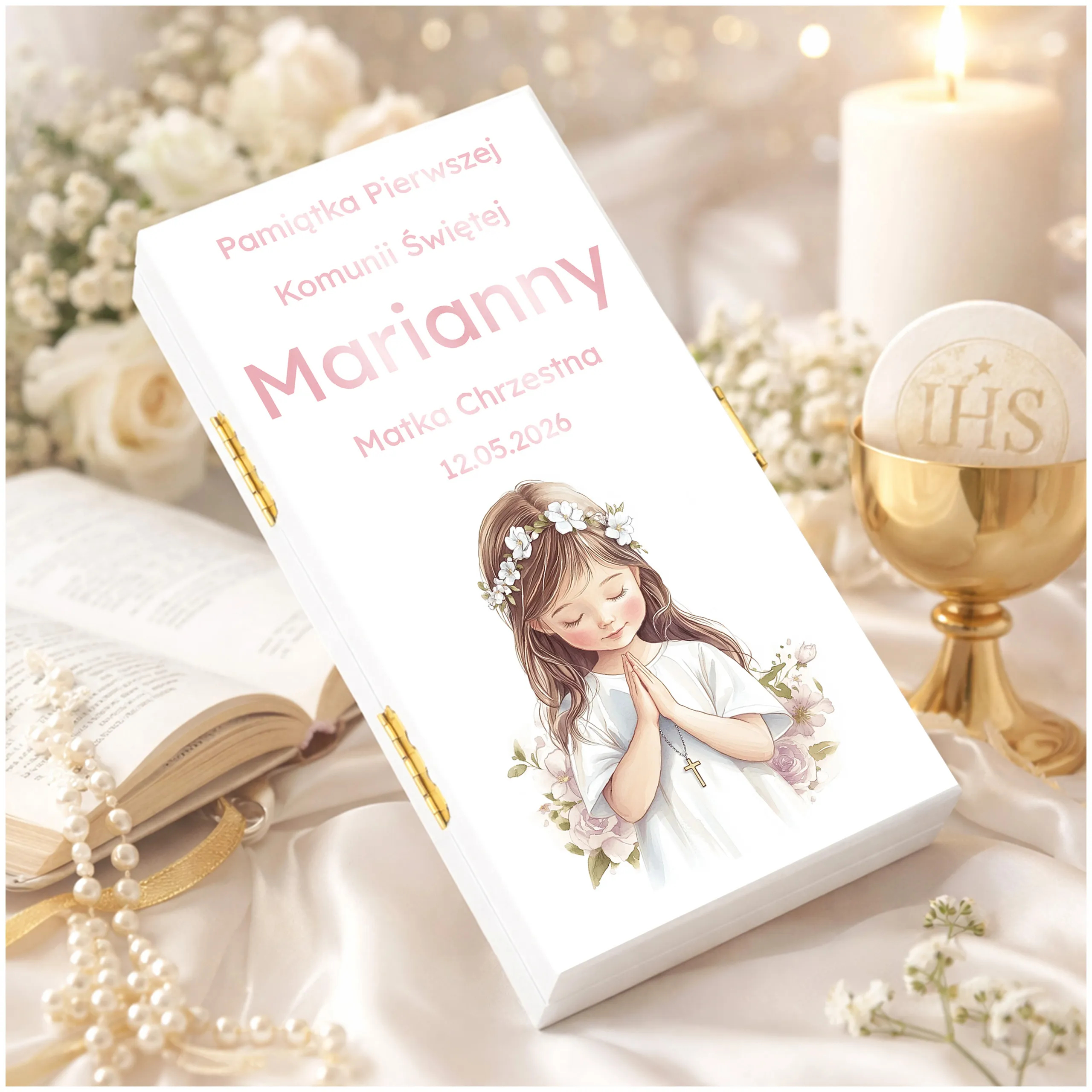 PAMIĄTKA PIERWSZEJ KOMUNII ŚWIĘTEJ - Pudełko na pieniądze na komunię, subtelna pamiątka na lata!