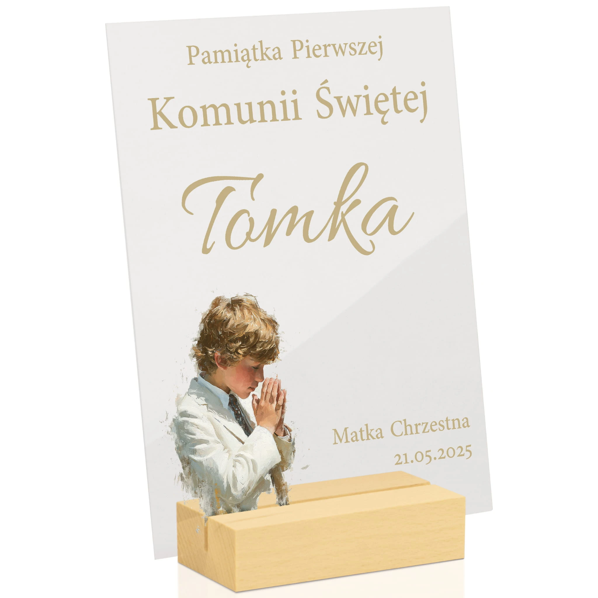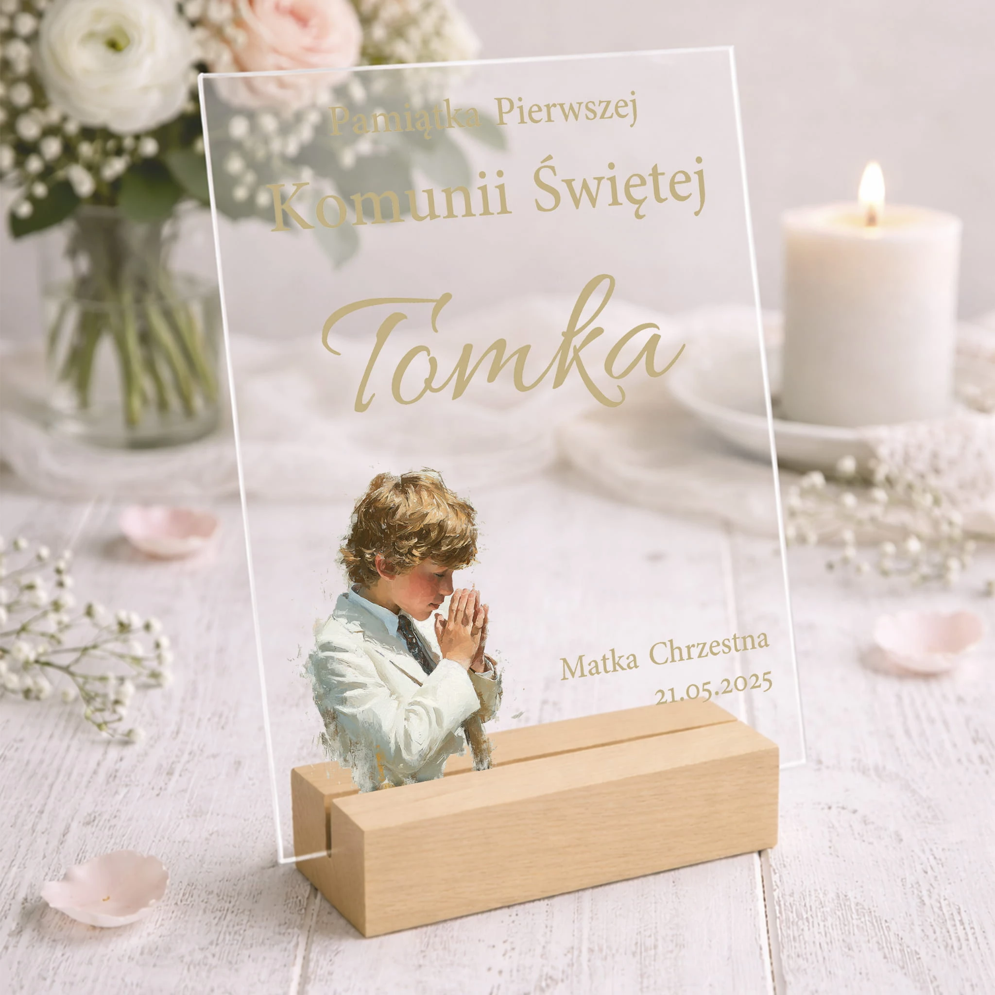 Szukasz prezentu komunijnego, który nie będzie przypadkowy ani banalny? Statuetka wykonana z przezroczystego akrylu to propozycja łącząca estetykę z symbolicznym znaczeniem - odpowiednia zarówno dla dziecka, jak i jako elegancki gest od chrzestnych czy bliskiej rodziny.