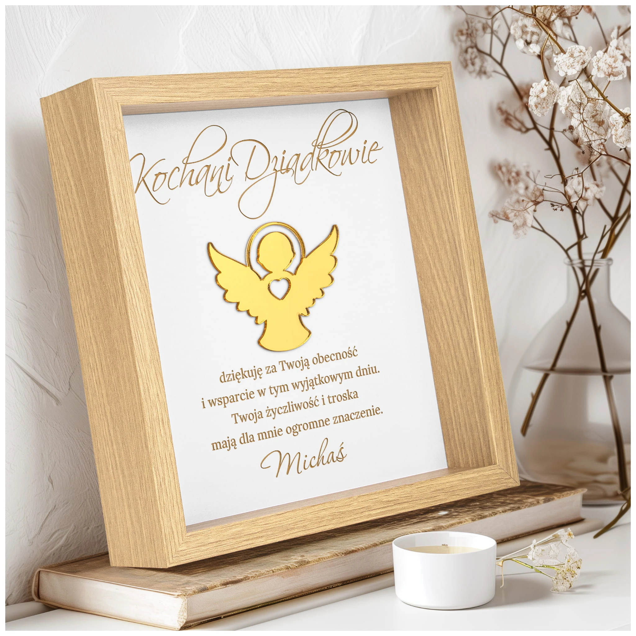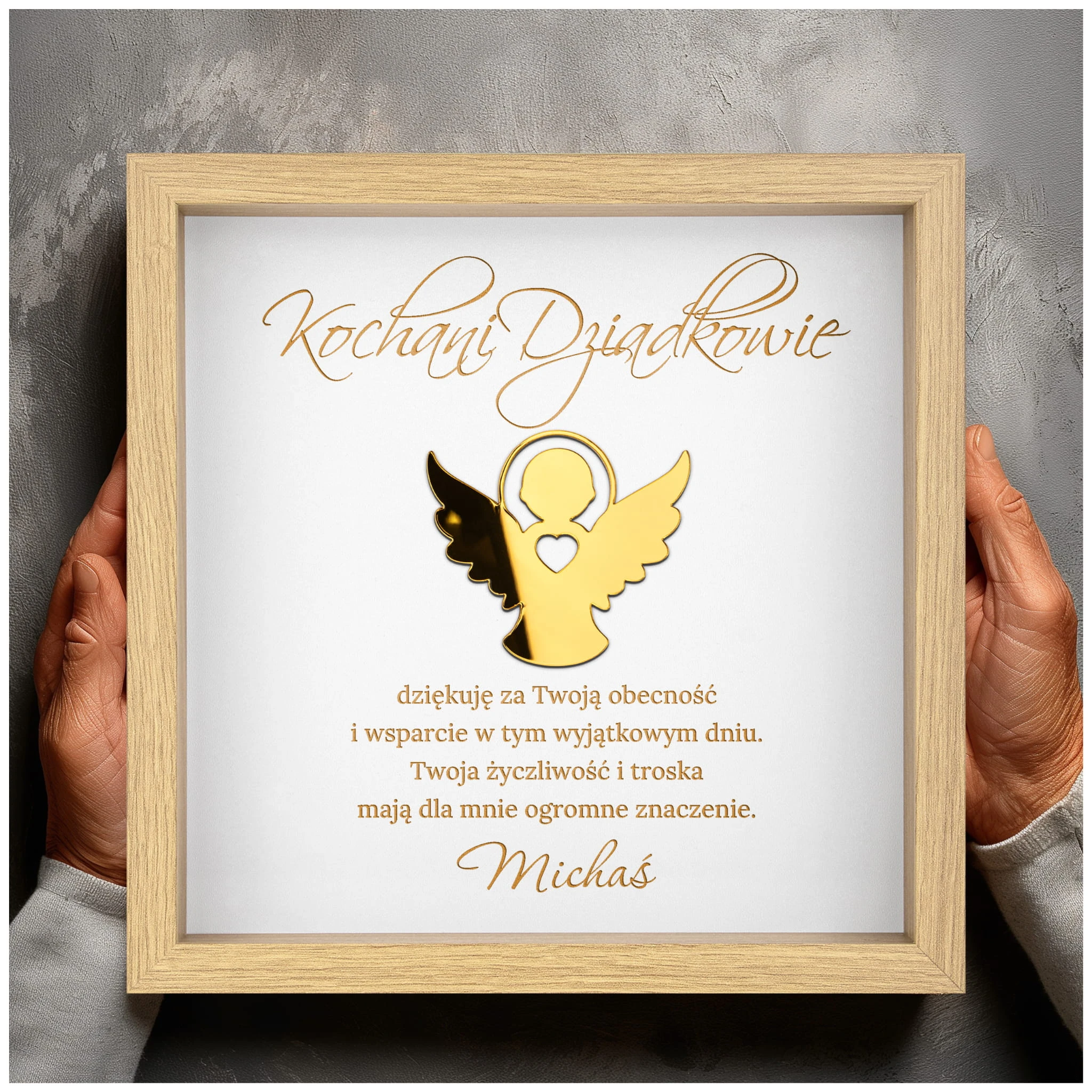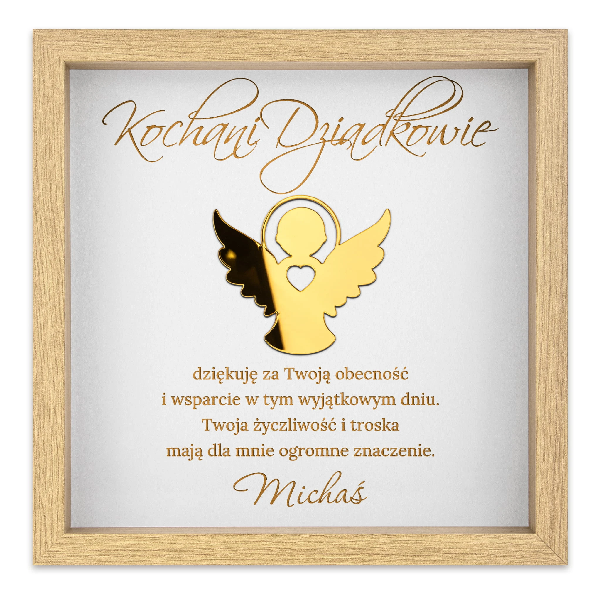 Ta elegancka, personalizowana ramka z życzeniami to piękny prezent dla dziecka z okazji Pierwszej Komunii Świętej! Złoty anioł z sercem symbolizuje opiekę i miłość, a nadrukowane życzenia sprawiają, że upominek nabiera głębokiego, duchowego znaczenia. Personalizacja imienia, daty oraz podpisu (np. od Matki Chrzestnej, Dziadków, Prababci) czyni tę pamiątkę jedyną w swoim rodzaju.
