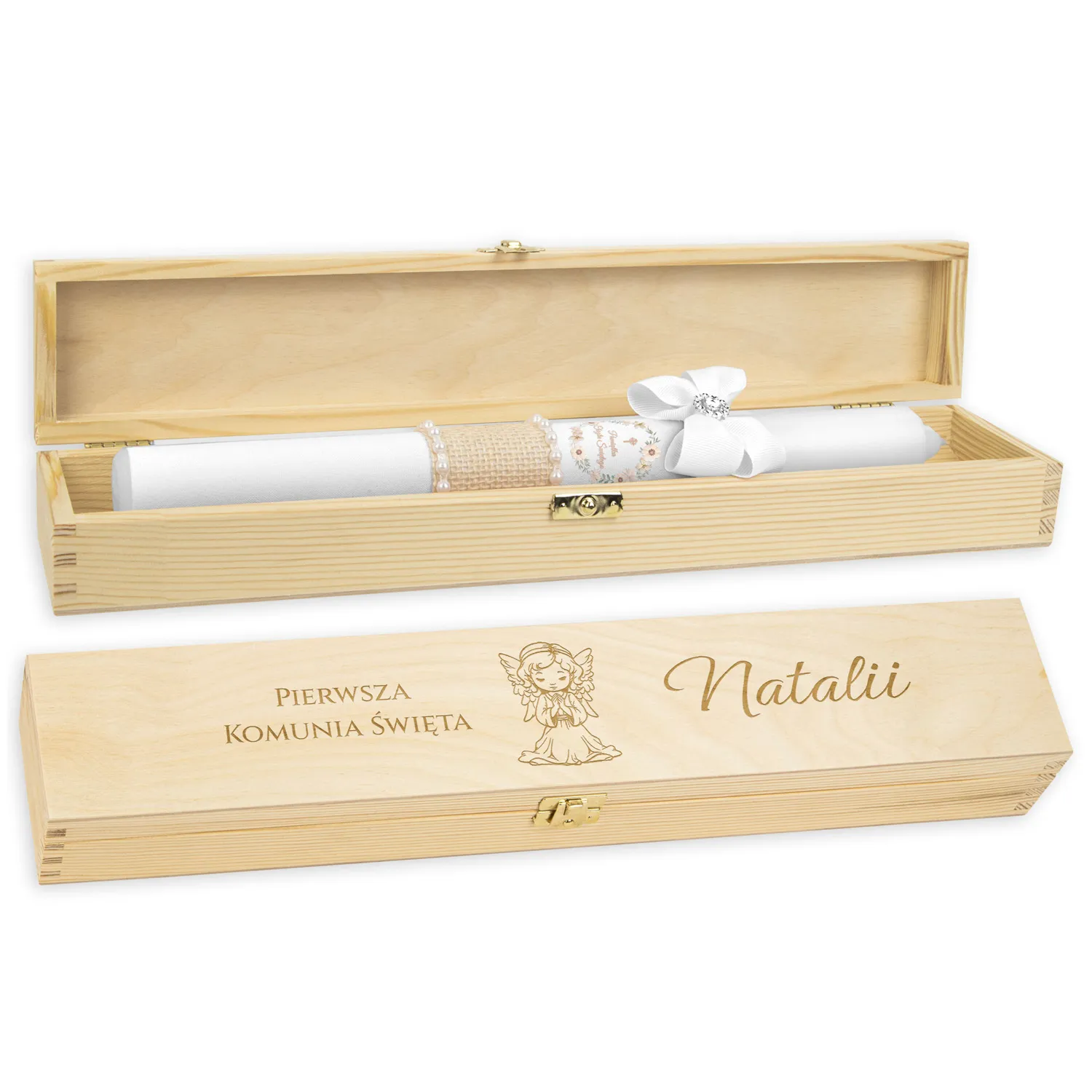 Grawerowane pudełko z imieniem - piękna pamiątka i idealny prezent dla chrześniaka. Świeca przechowywana w pudełku jest dobrze chroniona - będzie mogła służyć w niezmiennej formie podczas kolejnych uroczystości.