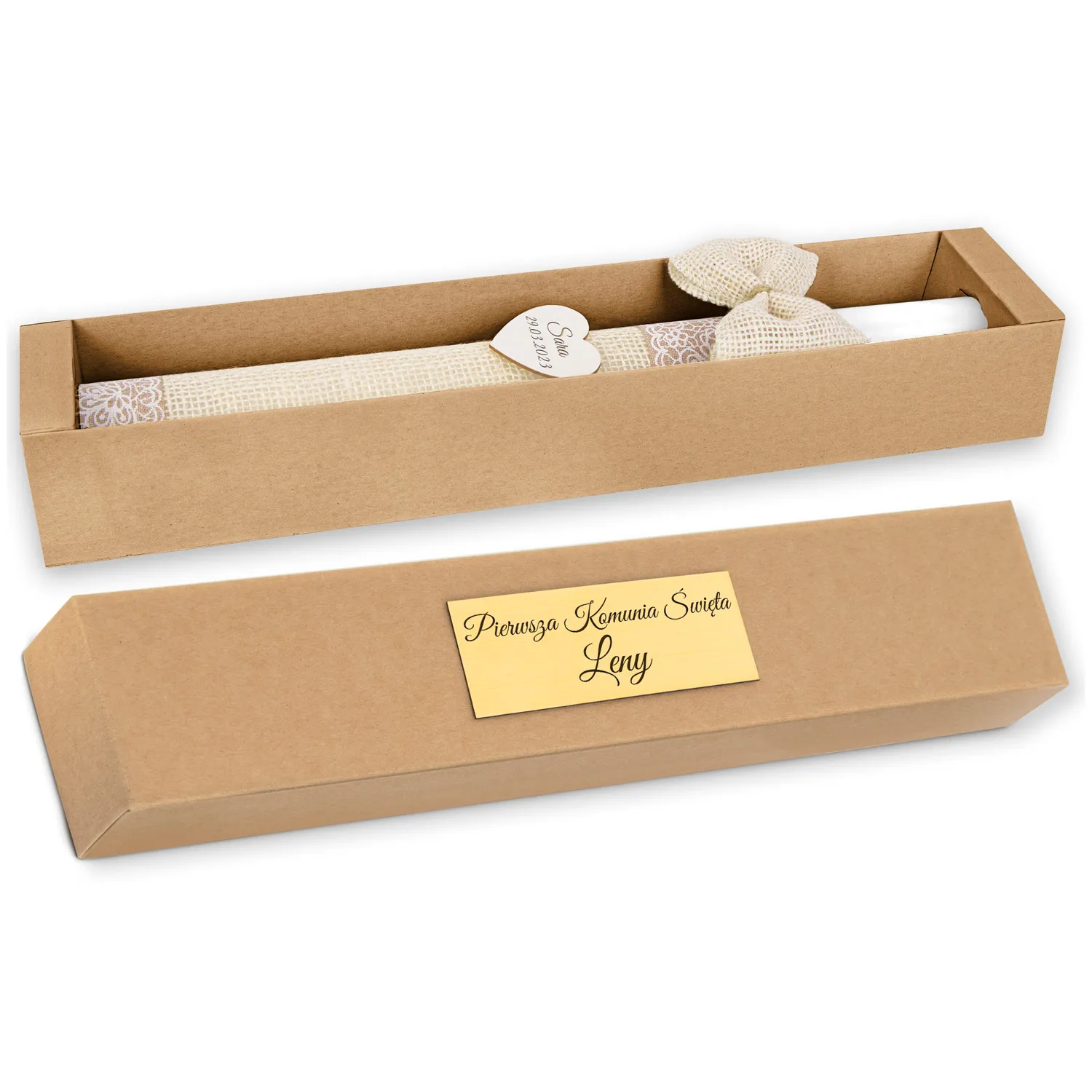 Pudełko na świecę karton kraft - piękna pamiątka i idealny prezent dla chrześniaka. Świeca przechowywana w pudełku jest dobrze chroniona - będzie mogła służyć w niezmiennej formie podczas kolejnych uroczystości.