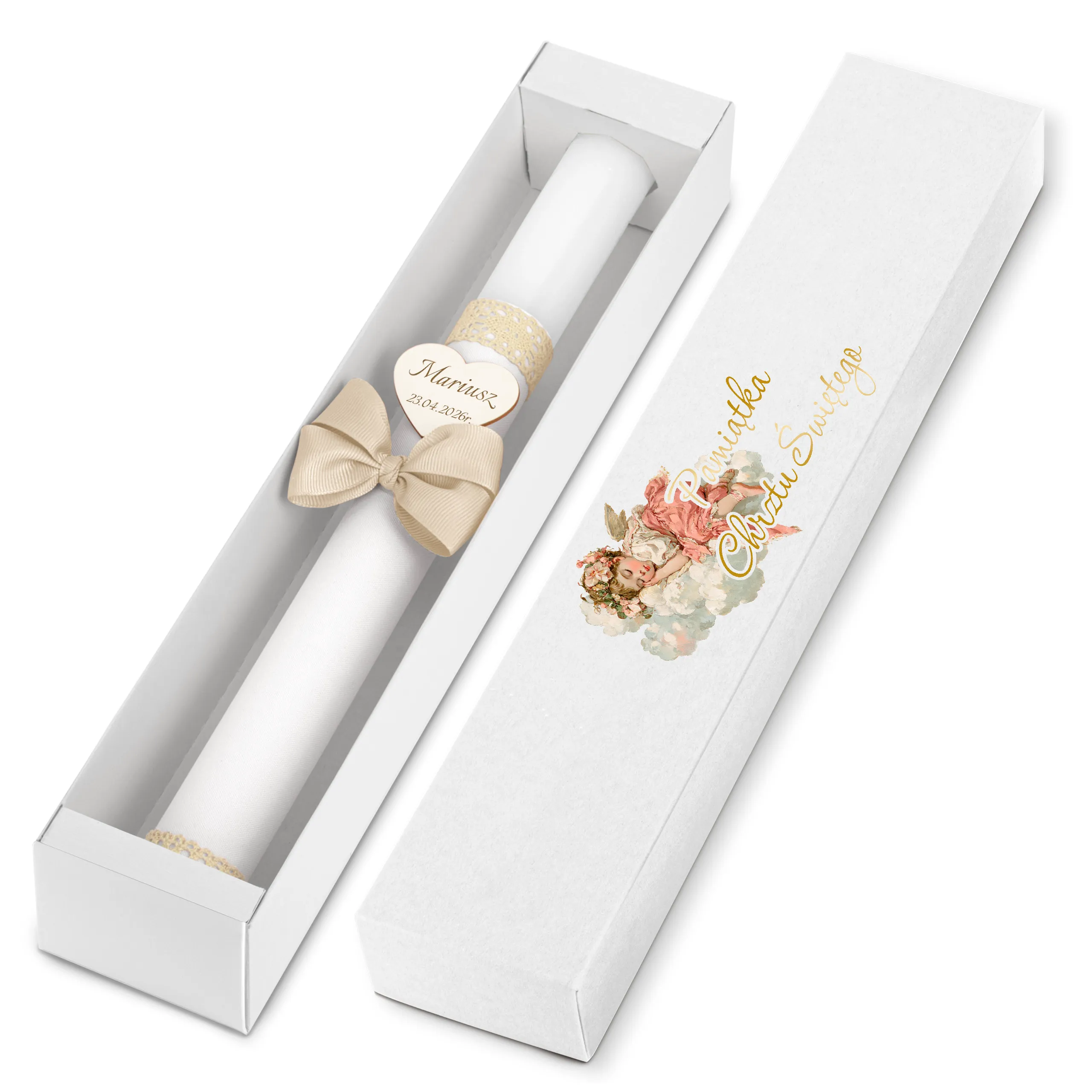 Pudełko karton kraft - piękna pamiątka i idealny prezent dla chrześniaka. Świeca przechowywana w pudełku jest dobrze chroniona - będzie mogła służyć w niezmiennej formie podczas kolejnych uroczystości.