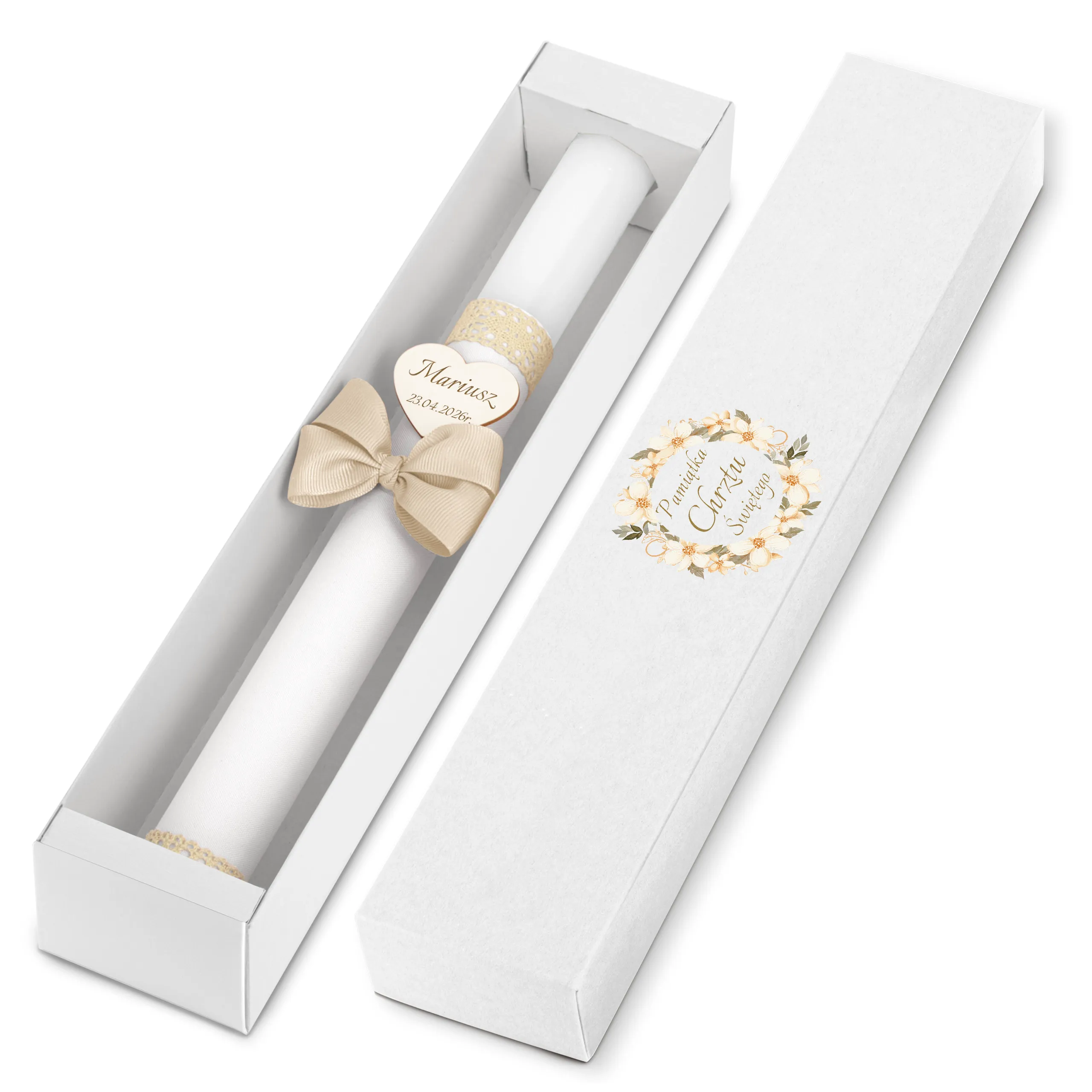 Pudełko karton kraft - piękna pamiątka i idealny prezent dla chrześniaka. Świeca przechowywana w pudełku jest dobrze chroniona - będzie mogła służyć w niezmiennej formie podczas kolejnych uroczystości.