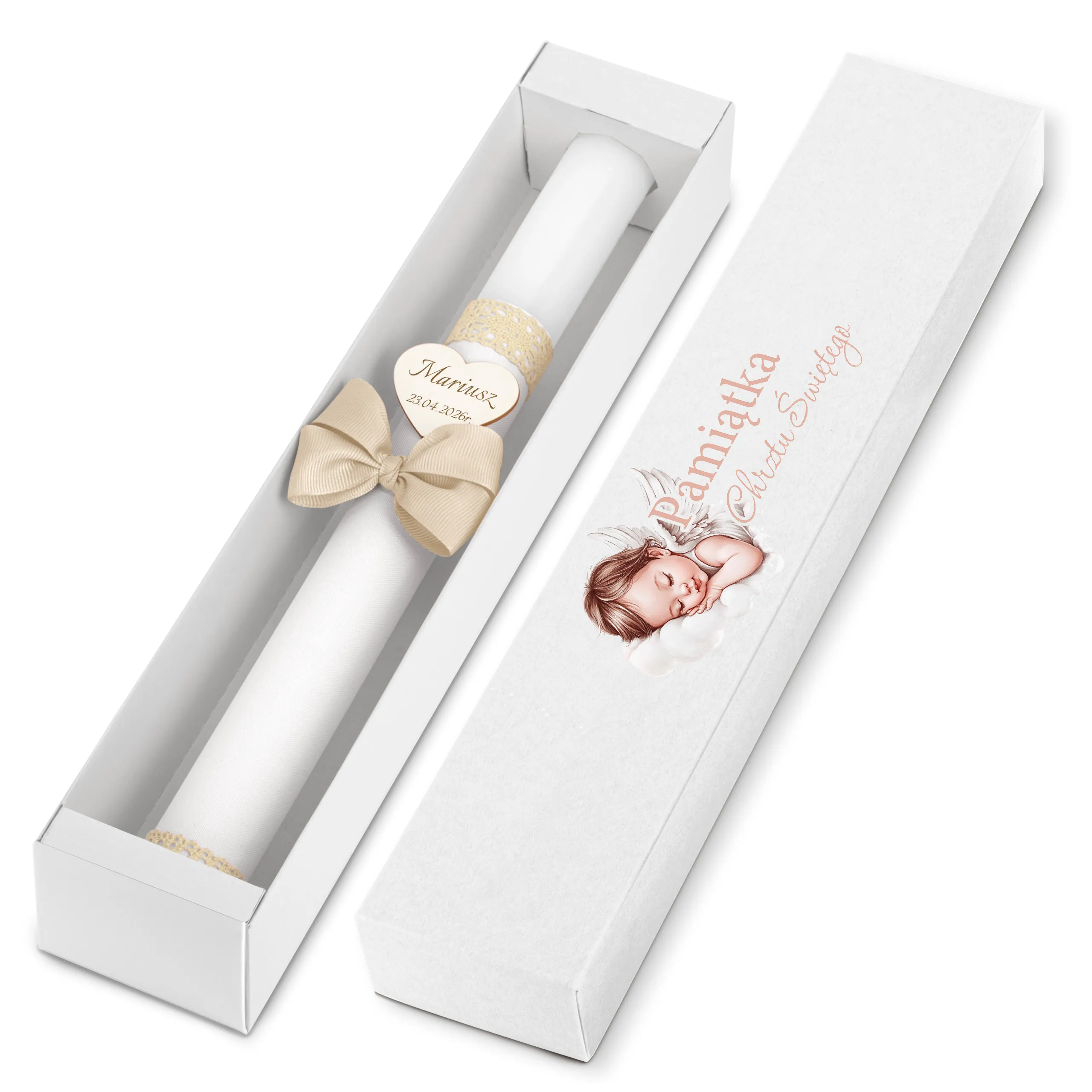 Pudełko karton kraft - piękna pamiątka i idealny prezent dla chrześniaka. Świeca przechowywana w pudełku jest dobrze chroniona - będzie mogła służyć w niezmiennej formie podczas kolejnych uroczystości.