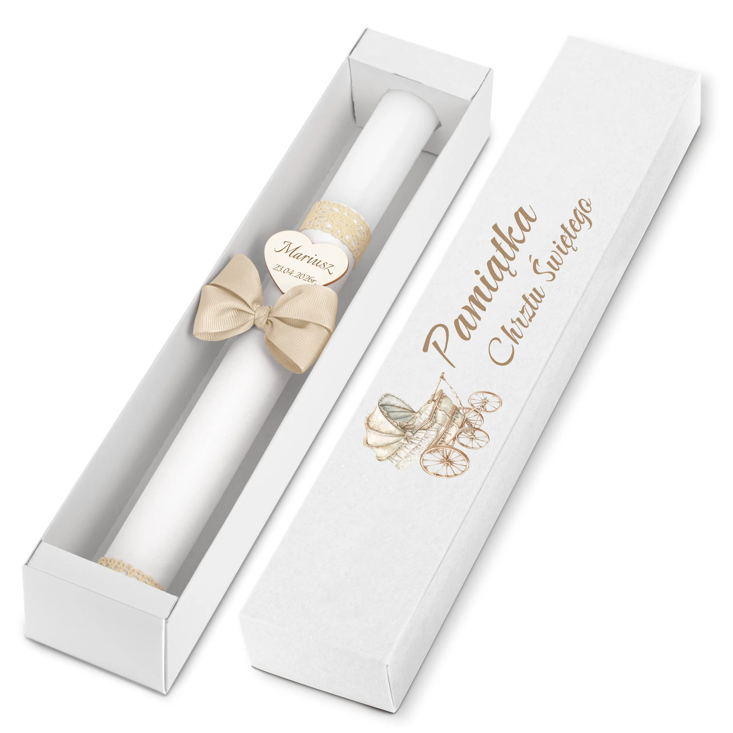 Pudełko karton kraft - piękna pamiątka i idealny prezent dla chrześniaka. Świeca przechowywana w pudełku jest dobrze chroniona - będzie mogła służyć w niezmiennej formie podczas kolejnych uroczystości.