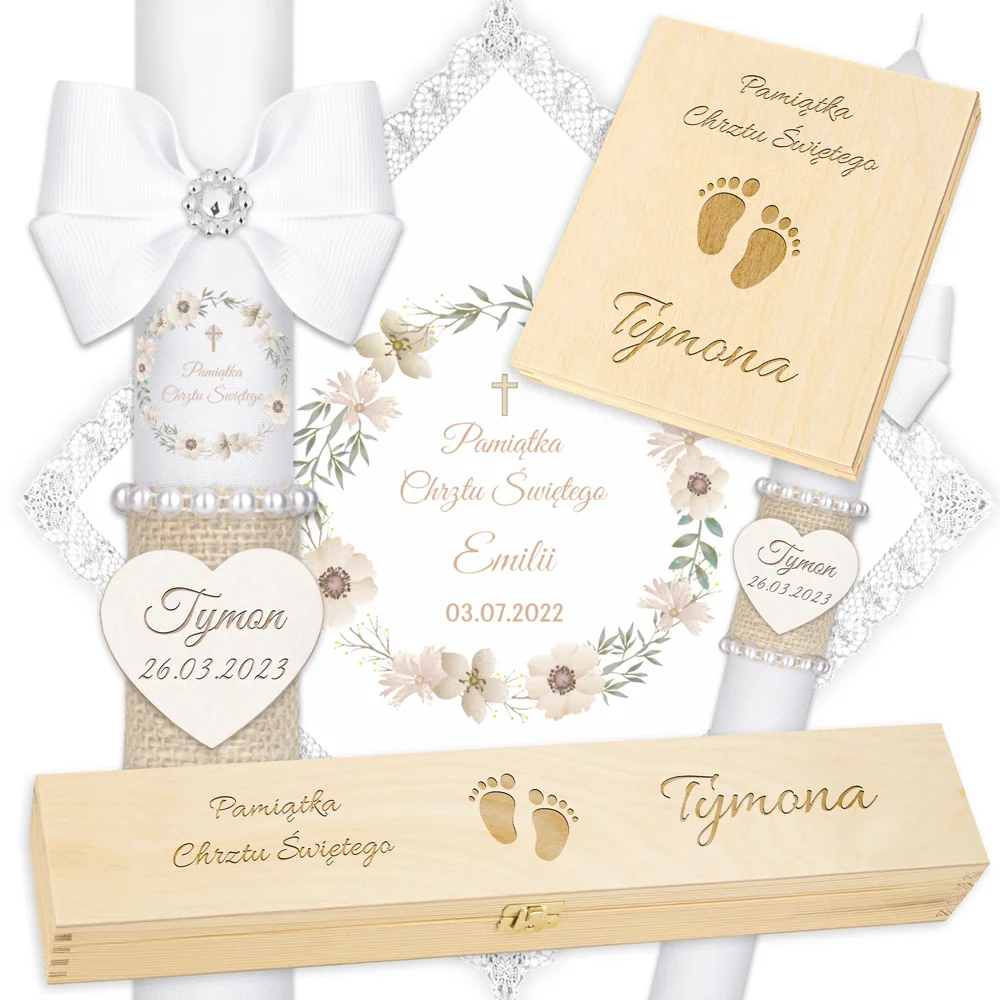 ✅ owinięcie materiałem satynowym z napisem "Pamiątka Chrztu Świętego"
