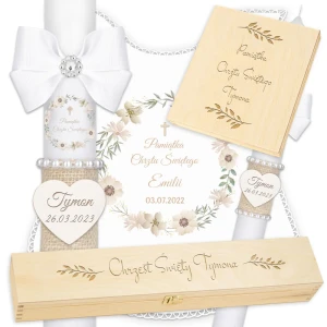✅ owinięcie materiałem satynowym z napisem "Pamiątka Chrztu Świętego"