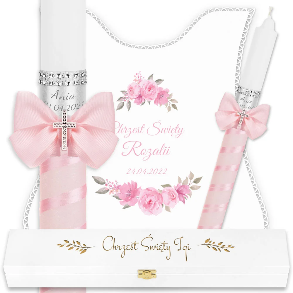 ✅ personalizacja (imię oraz data chrztu) na świecy oraz szatce.