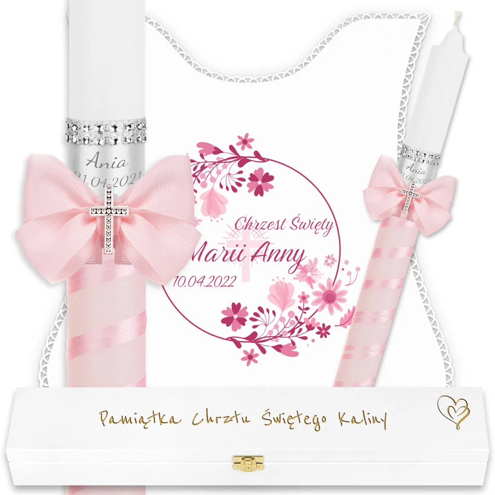 Ręcznie zdobiony zestaw Świeca oraz szatka do Chrztu Świętego.