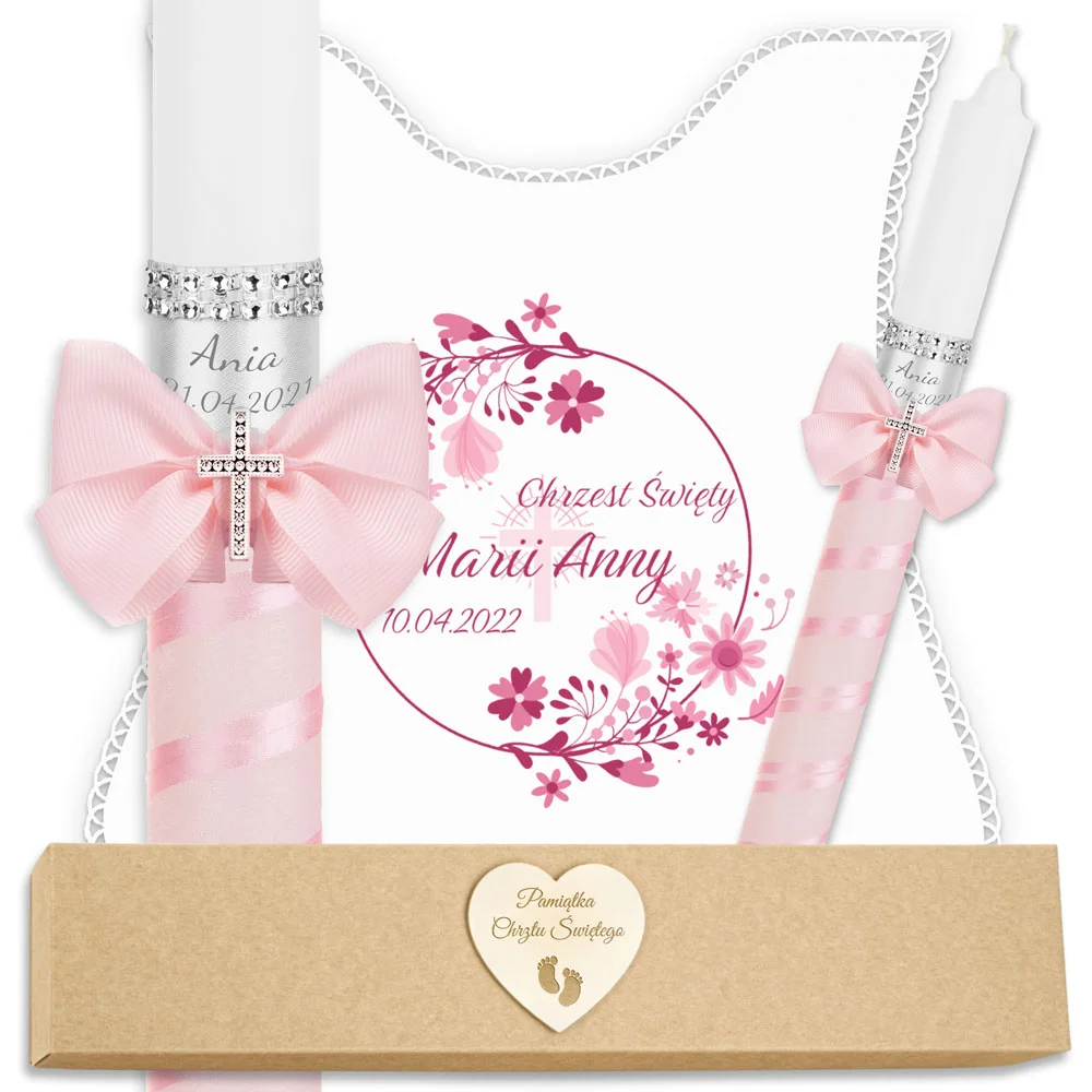 Ręcznie zdobiony zestaw Świeca oraz szatka do Chrztu Świętego.