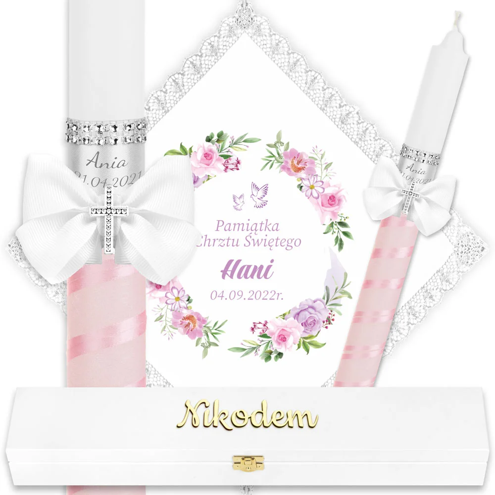 Ręcznie zdobiony zestaw Świeca oraz szatka do Chrztu Świętego.