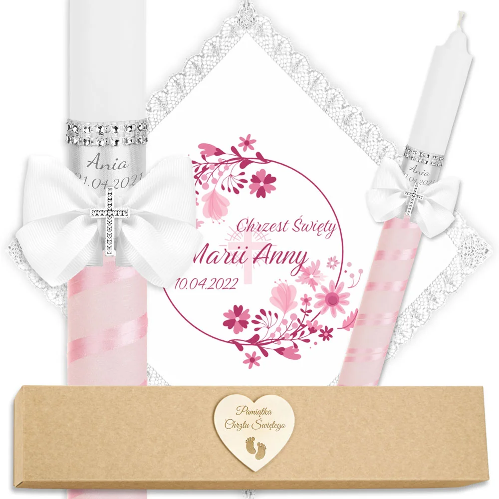 Ręcznie zdobiony zestaw Świeca oraz szatka do Chrztu Świętego.