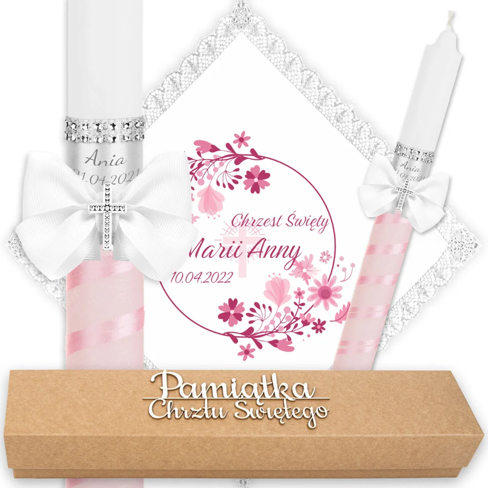 Ręcznie zdobiony zestaw Świeca oraz szatka do Chrztu Świętego.