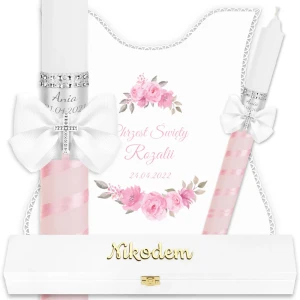 Ręcznie zdobiony zestaw Świeca oraz szatka do Chrztu Świętego.
