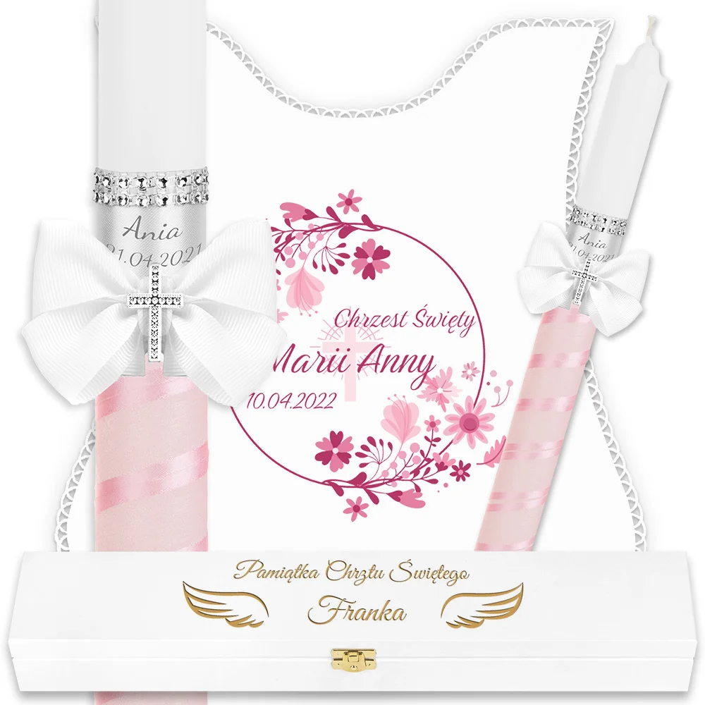 Ręcznie zdobiony zestaw Świeca oraz szatka do Chrztu Świętego.