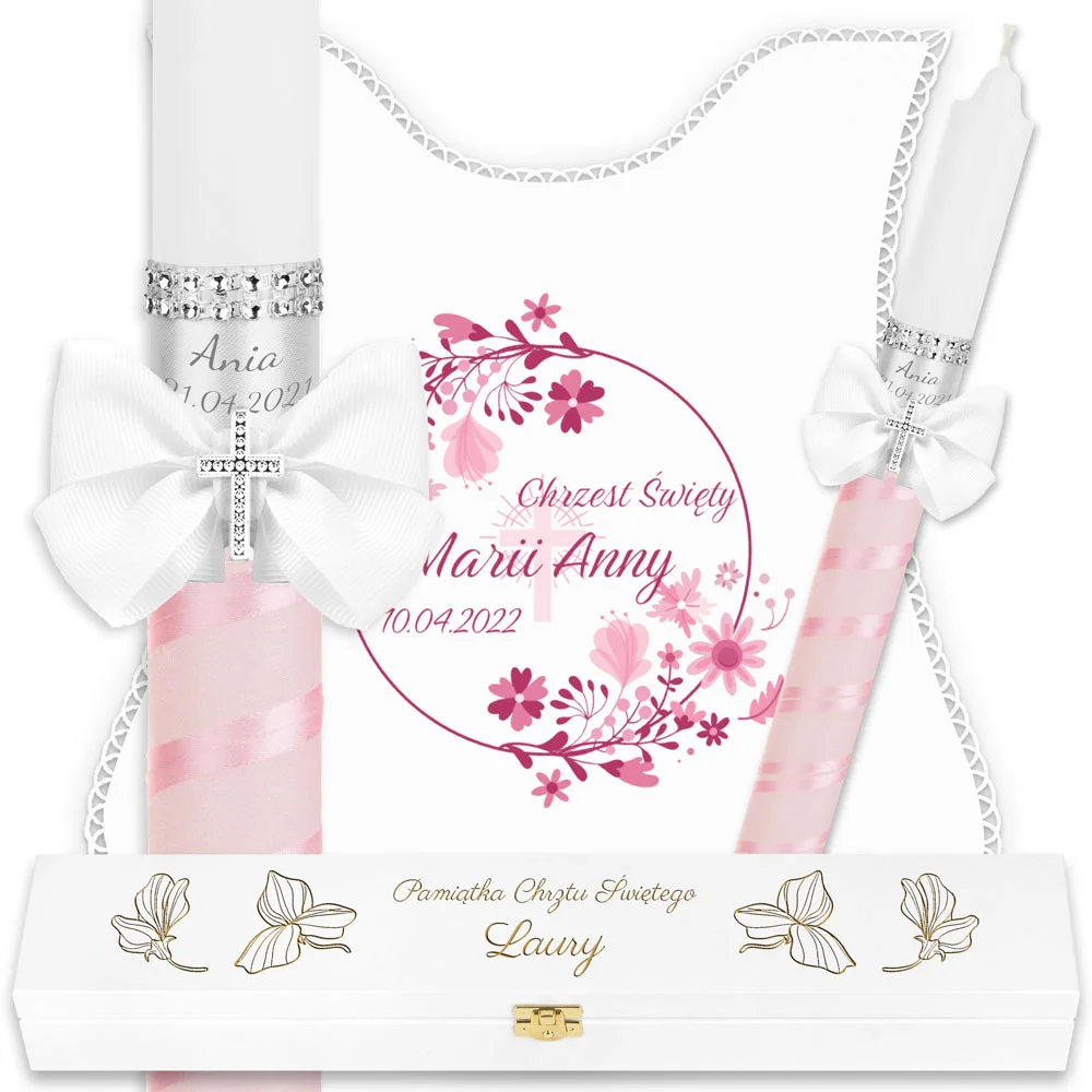 Ręcznie zdobiony zestaw Świeca oraz szatka do Chrztu Świętego.