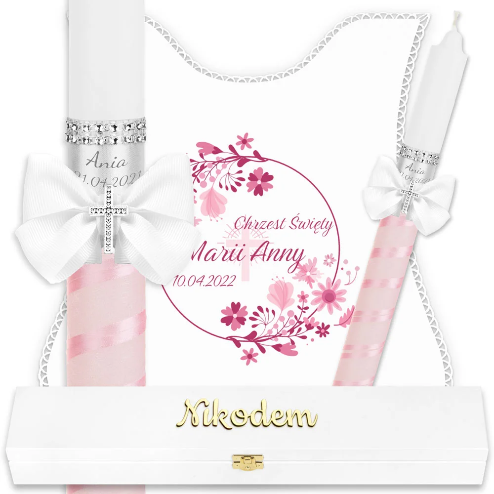 Ręcznie zdobiony zestaw Świeca oraz szatka do Chrztu Świętego.