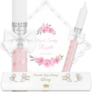 Ręcznie zdobiony zestaw Świeca oraz szatka do Chrztu Świętego.