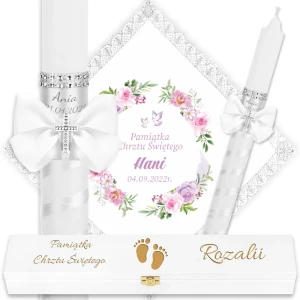 ✅ personalizacja (imię oraz data chrztu) na świecy oraz szatce.