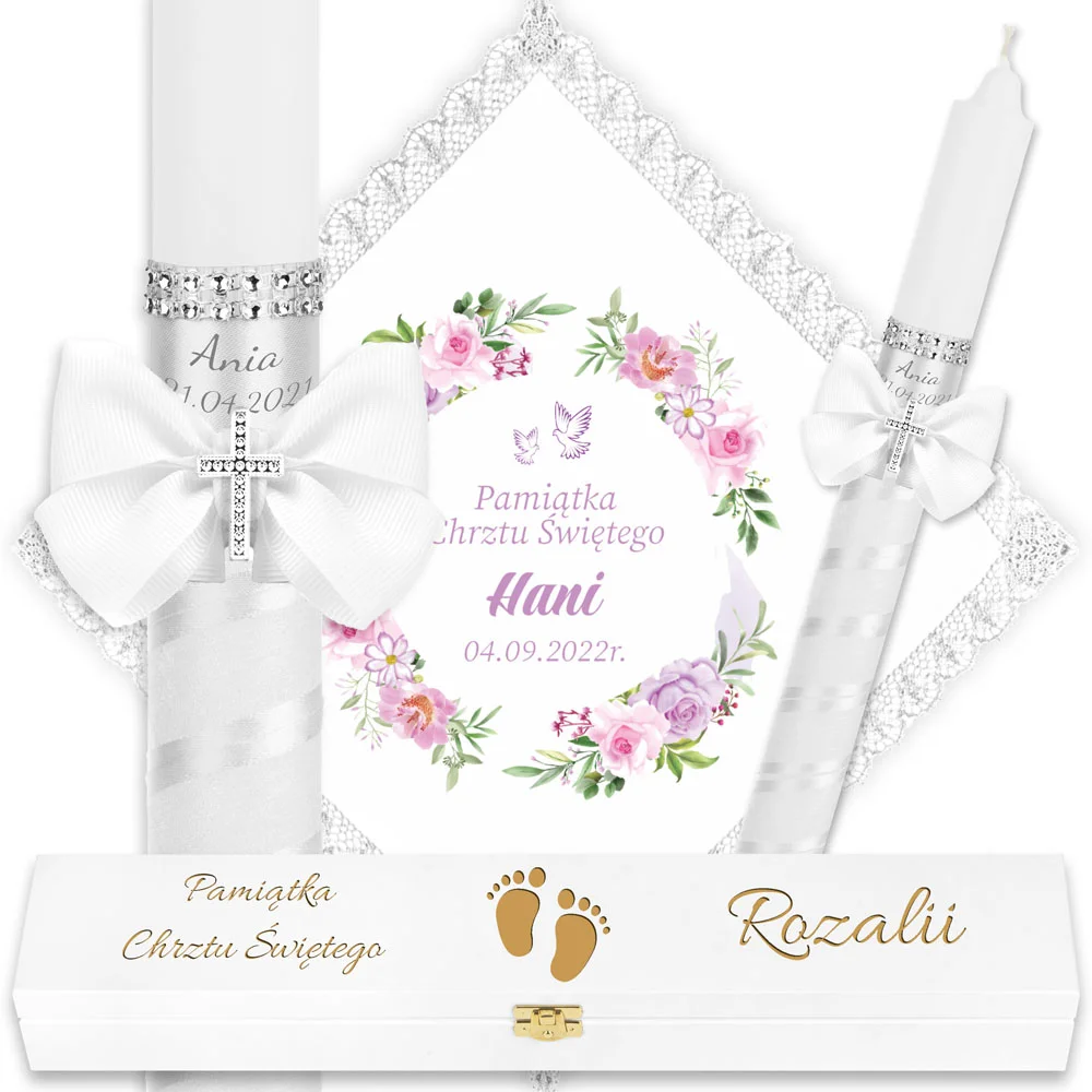 Ręcznie zdobiony zestaw Świeca oraz szatka do Chrztu Świętego.