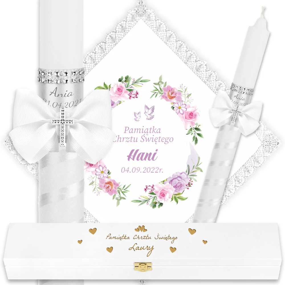 Ręcznie zdobiony zestaw Świeca oraz szatka do Chrztu Świętego.