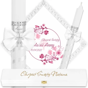 Ręcznie zdobiony zestaw Świeca oraz szatka do Chrztu Świętego.
