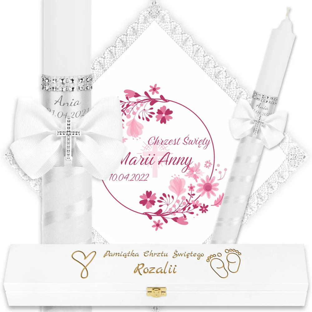 Ręcznie zdobiony zestaw Świeca oraz szatka do Chrztu Świętego.