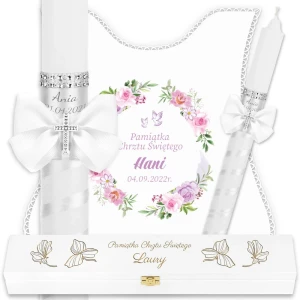 Ręcznie zdobiony zestaw Świeca oraz szatka do Chrztu Świętego.