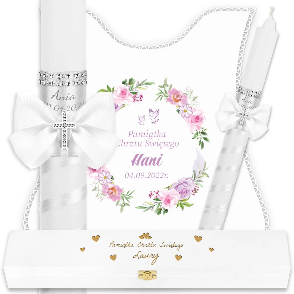 Ręcznie zdobiony zestaw Świeca oraz szatka do Chrztu Świętego.