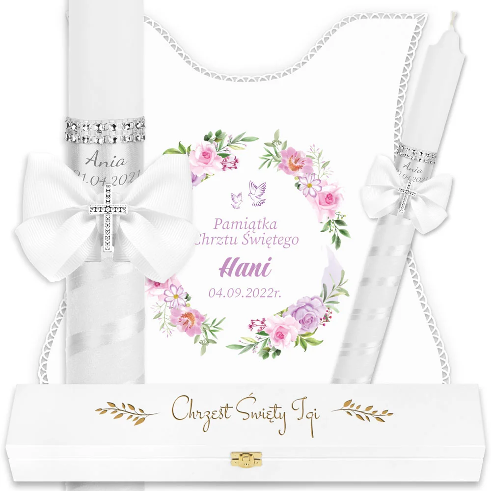 Ręcznie zdobiony zestaw Świeca oraz szatka do Chrztu Świętego.