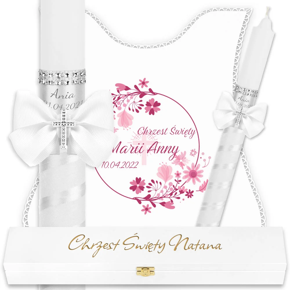 Ręcznie zdobiony zestaw Świeca oraz szatka do Chrztu Świętego.