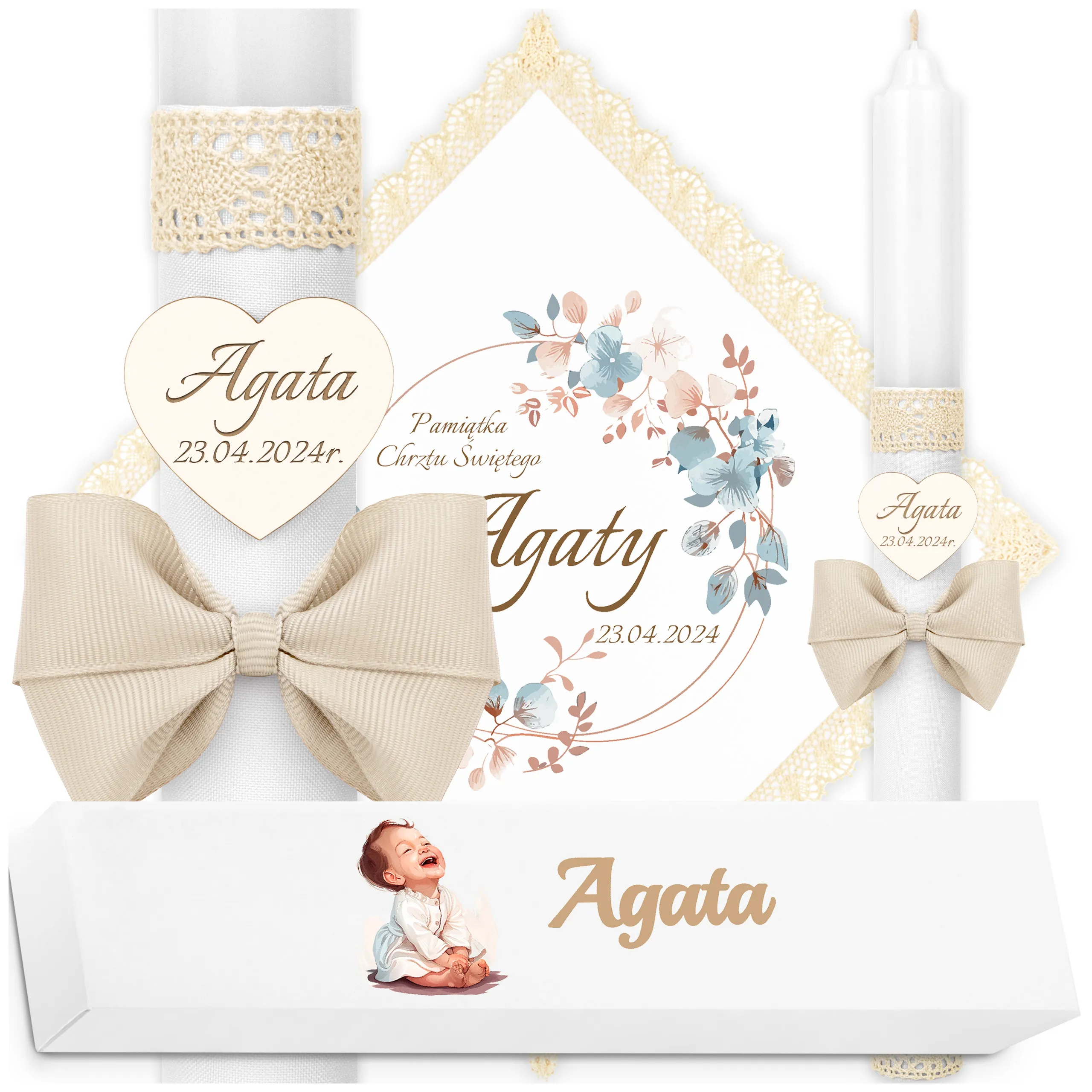 ✅ świeca na chrzest wraz z personalizacją (imieniem dziecka i datą chrztu),
