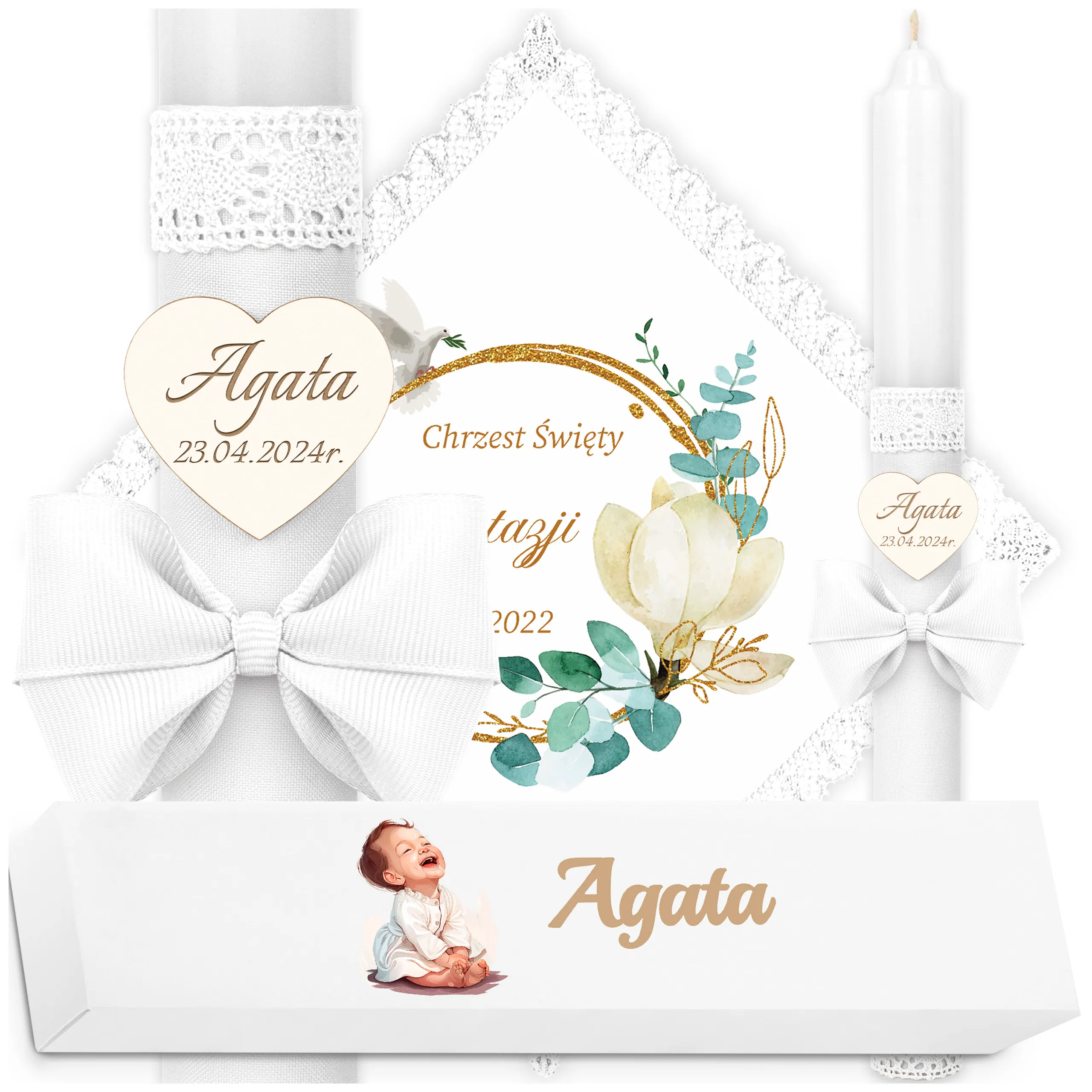 ✅ świeca na chrzest wraz z personalizacją (imieniem dziecka i datą chrztu),