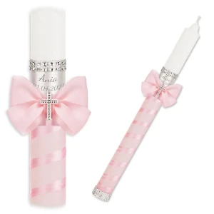 W centralnej części dekoracji znajduje się różowa satynowa kokarda, która harmonijnie komponuje się z całą stylizacją. Na jej środku umieszczono srebrny krzyż ozdobiony kryształkami, który nadaje świecy duchowego znaczenia. Ten szczegół czyni świecę do chrztu dziewczynka nie tylko estetyczną, ale również pełną symboliki, idealną na tak ważną okazję.