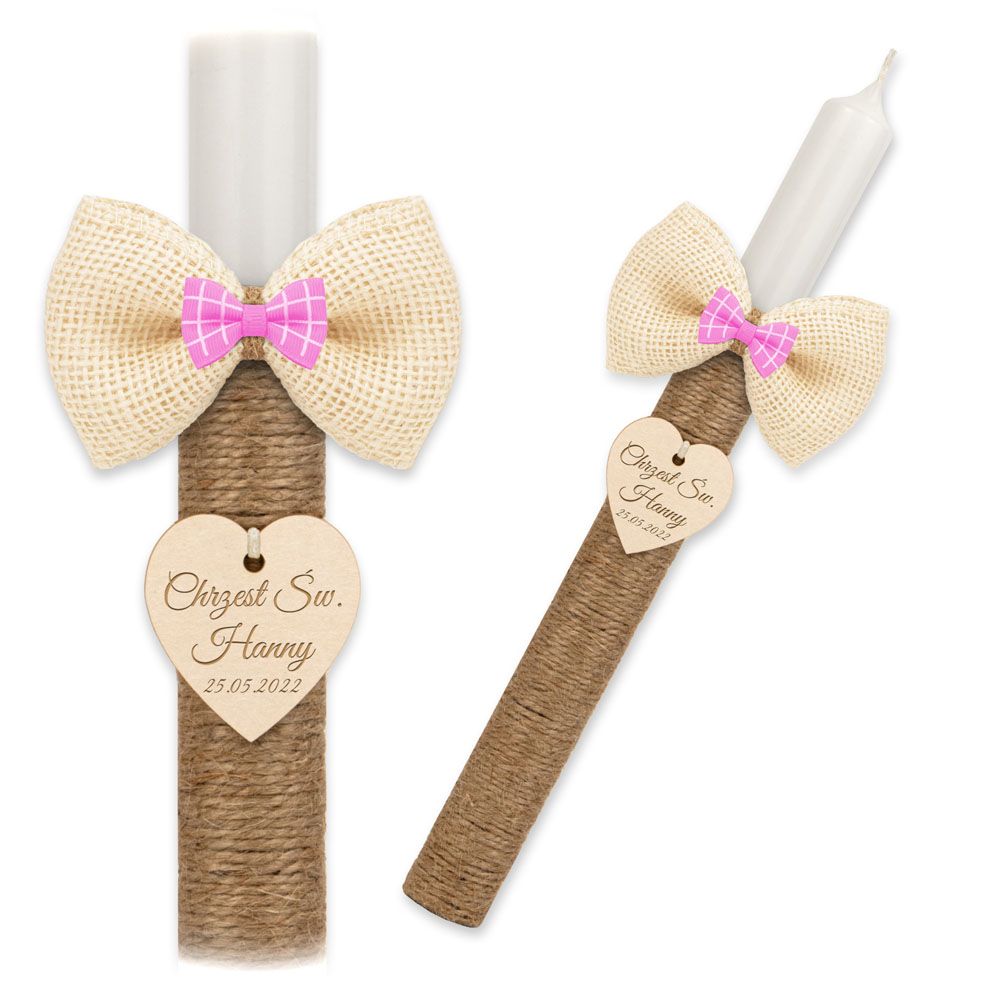 Świeca została ozdobiona brązowym sznurkiem jutowym, który owija jej powierzchnię na 2/3 długości, nadając jej delikatny, naturalny charakter. Na górze dekoracji umieszczona jest kokardka z jasnej siatki jutowej, a jej centralnym punktem jest urocza różowa kokardka w kratkę – subtelny akcent podkreślający delikatność i dziewczęcy styl.
