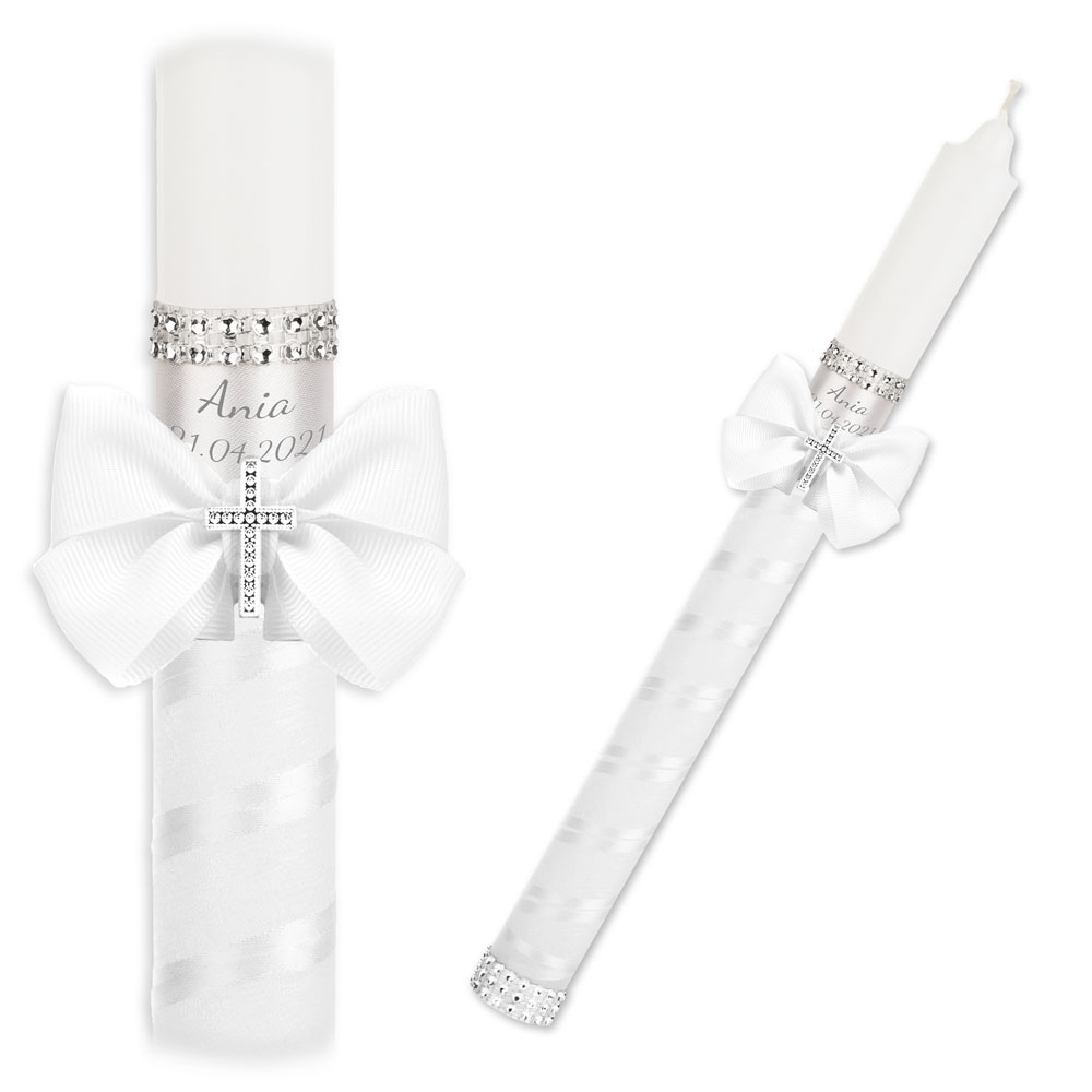 W dolnej części satynowego owijania świecy umieszczono opaski zdobione srebrnymi kryształkami, które dodają całości subtelnego blasku. Na szczycie świecy znajduje się biała satynowa kokarda, w której centralnym punktem jest przyklejony srebrny krzyż ozdobiony kryształkami – symbol duchowości i opieki. Nad kokardą umieszczono elegancką, srebrną opaskę z nadrukiem, na której można dodać imię dziecka i datę chrztu. Całość opaski dopełniają dwa rzędy błyszczących kryształków, podkreślając ekskluzywny styl personalizowanej gromnicy do chrztu.