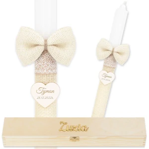Ta elegancka świeca w rustykalnym stylu została w 2/3 owinięta beżową siatką jutową, której dopełnieniem jest kokarda i subtelna tasiemka z białymi wzorami imitującymi koronkę. Na środku świecy umieszczono drewniane serce, na którym można wygrawerować imię dziecka oraz datę chrztu. Dzięki temu świeca i pudełko na chrzest tworzą spersonalizowany zestaw, który staje się piękną pamiątką na całe życie.