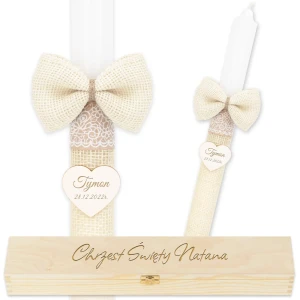 Zestaw łączy w sobie klasyczną białą świecę oraz drewniane pudełko, które tworzą wyjątkową całość. Świeca ozdobiona jest beżową siatką jutową, stylową kokardą i neutralną tasiemką z białymi wzorami, które subtelnie przypominają koronkę. Drewniane serce z personalizowanym grawerem sprawia, że świeca i pudełko na chrzest dla chłopca to niezwykła pamiątka tego ważnego dnia.