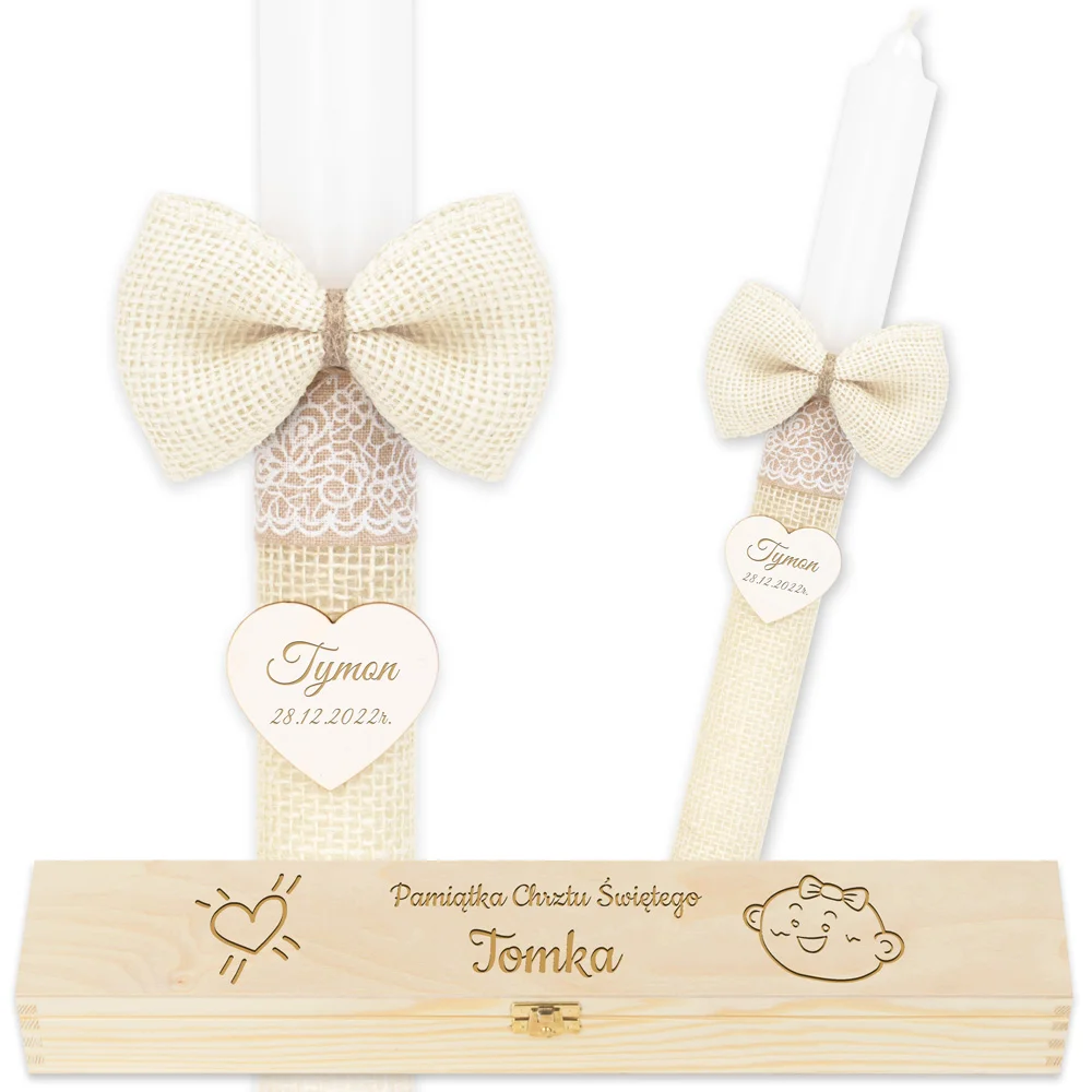 W centralnym punkcie świecy umieszczono drewniane serduszko, na którym wygrawerujemy imię dziecka oraz datę chrztu. Całość prezentuje się szlachetnie i ponadczasowo. Świeca i drewniane pudełko na chrzest dla dziewczynki to nie tylko zestaw dekoracyjny, ale gotowy symbol duchowego początku w pięknej, ręcznie dopracowanej formie.