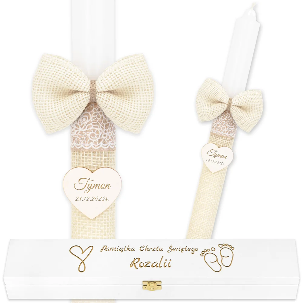 Ta świeca do chrztu w drewnianym pudełku dla dziewczynki to połączenie naturalnego uroku z subtelnym wdziękiem. Biała świeca ozdobiona jest jasną beżową siatką jutową i kokardą z tego samego materiału, pod którą umieszczono elegancką tasiemkę w neutralnym odcieniu z białymi wzorami przypominającymi koronkę. Na środku świecy znajduje się drewniane serce, które można spersonalizować, grawerując imię dziecka i datę chrztu. Całość prezentuje się wyjątkowo harmonijnie i naturalnie, idealna pamiątka pierwszego sakramentu.