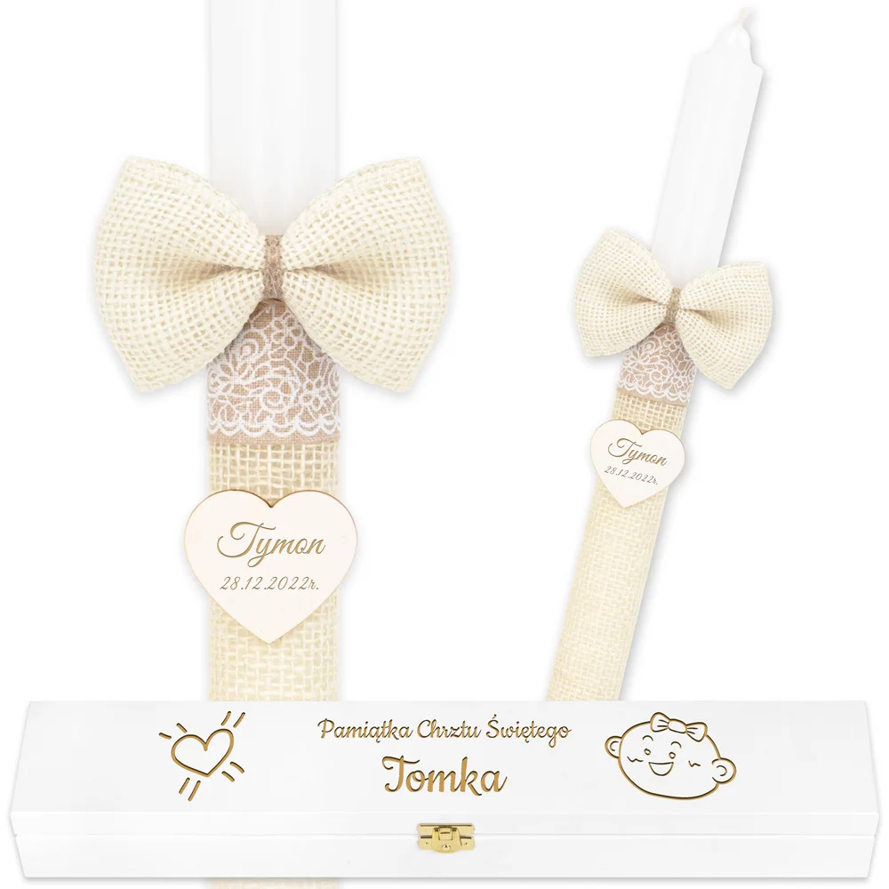 W komplecie znajduje się drewniana skrzyneczka pomalowana na biało, zaprojektowana specjalnie jako oprawa dla świecy. Na środku górnej przykrywki wygrawerowano napis „Pamiątka Chrztu Świętego” w jednej linii, a poniżej – imię dziecka w drugiej. Kompozycję uzupełniają delikatne grawery: po lewej stronie serce, a po prawej kreskówkowa buzia dziecka z kokardką na głowie, co nadaje pudełku lekkości i dziewczęcego charakteru.