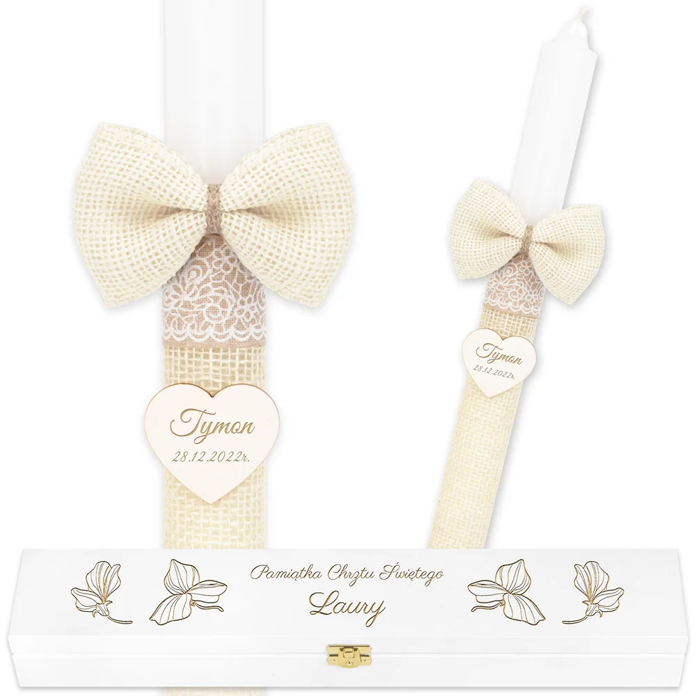 Personalizowana świeca do chrztu w drewnianym pudełku to harmonijne połączenie prostoty, naturalnych materiałów i subtelnych detali. Biała świeca została owinięta w 2/3 wysokości jasną, beżową siatką jutową, która nadaje całości ciepłego i spokojnego charakteru. Górną część zdobi kokarda z tej samej jutowej siatki, a tuż pod nią znajduje się tasiemka w ciemniejszym, neutralnym odcieniu, ozdobiona białymi wzorami przypominającymi delikatną koronkę. Taka sama tasiemka wykańcza świecę u dołu, tworząc spójną kompozycję typową dla zestawu, jakim jest personalizowana świeca do chrztu w drewnianym pudełku.